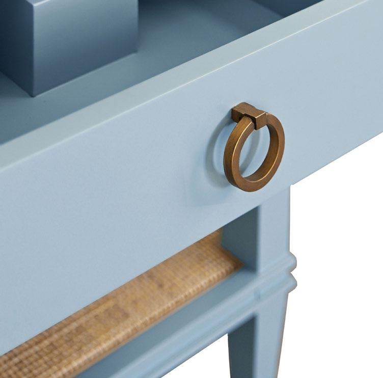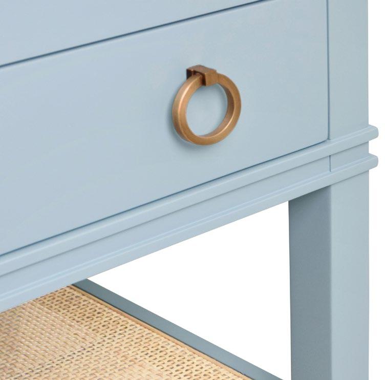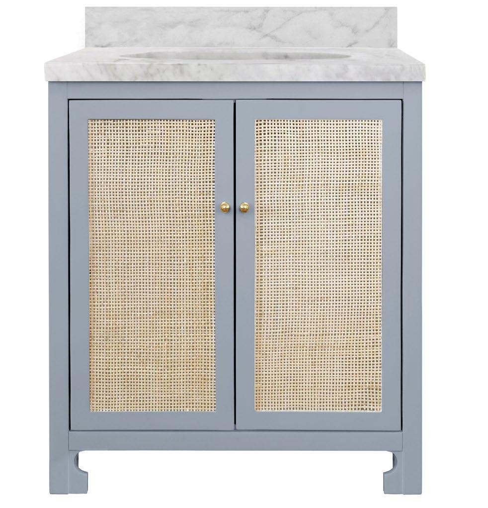 With its bright and airy aesthetic, our Boyd vanity brings understated luxury to your Mid Century, Farmhouse or Scandinavian-inspired bathroom. Simple and refined, the natural cane door fronts are encased in matte light blue lacquer (LB) or matte white lacquer (WH) with brass knob hardware. Included are a white and grey Carrara marble top and backsplash plus a white porcelain sink.