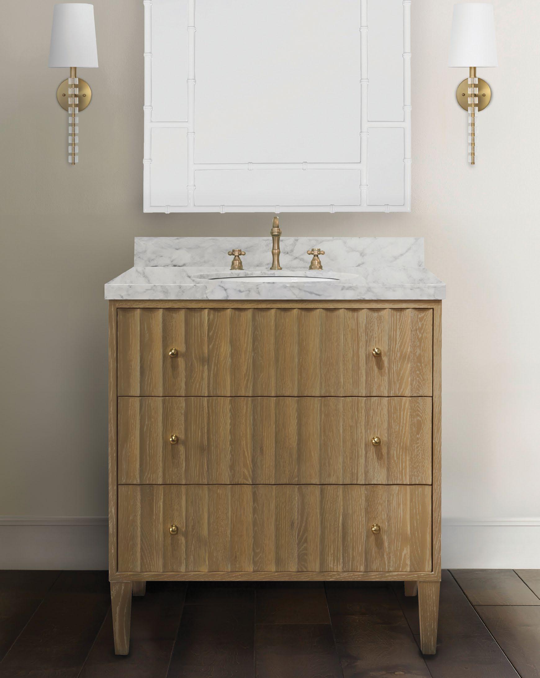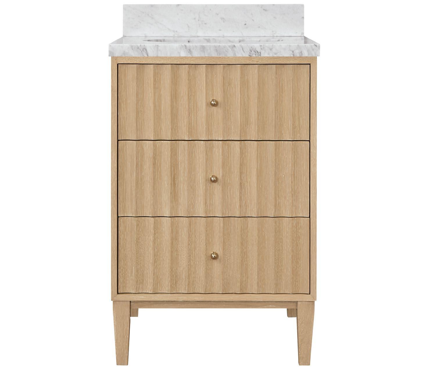 Step into a timeless age of elegance with the Rhodes CO bath vanity. Infused with the influence of ancient Greek architecture, Rhodes acquires a hint of antiquity through its horizontal fluted details and cerused oak finish, all while maintaining contemporary sensibility. Topping off the base is a white and grey Carrara marble top and backsplash, white porcelain sink, and polished brass knobs.