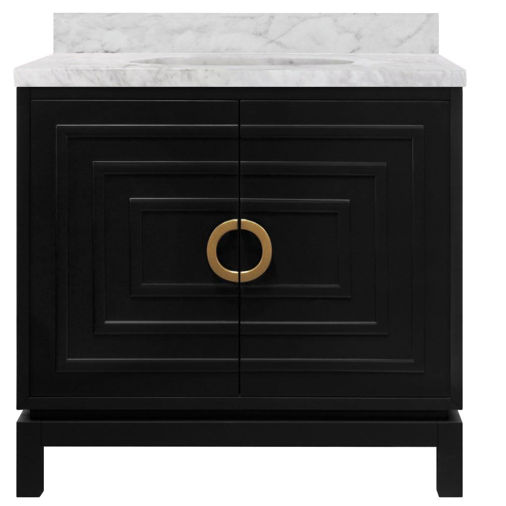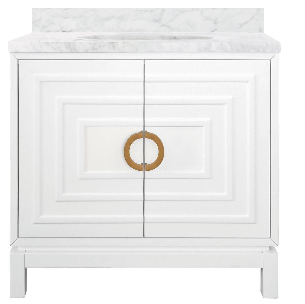 The Art Deco-inspired Bixby bath vanity is the ultimate centerpiece for your primary bath or powder room. Bixby delights in a cerused oak (CO), matte black lacquer (BLK), or matte white lacquer (WH) finish and a repeating raised square pattern with antique brass circle hardware. The Bixby is crowned with a white and grey Carrara marble top and backsplash as well as a white porcelain sink.