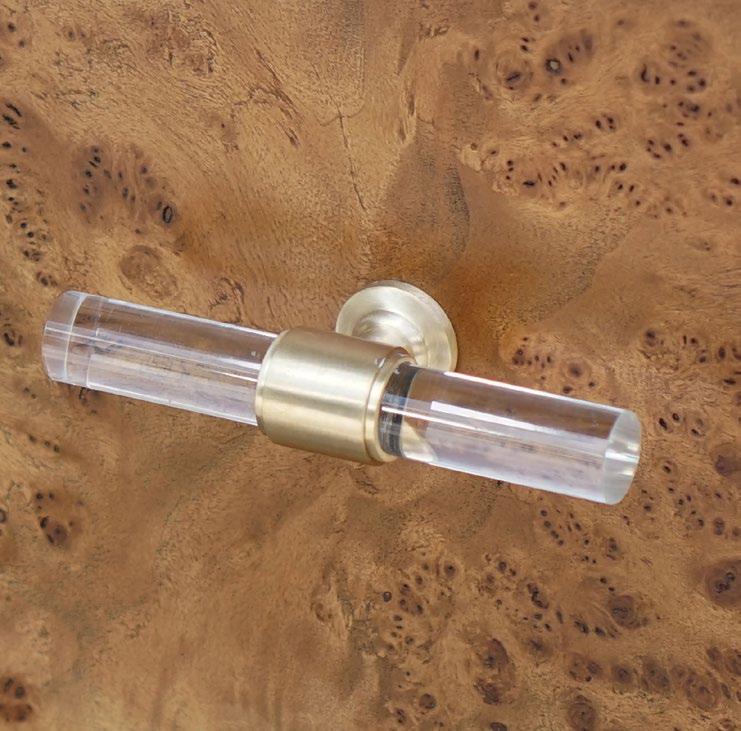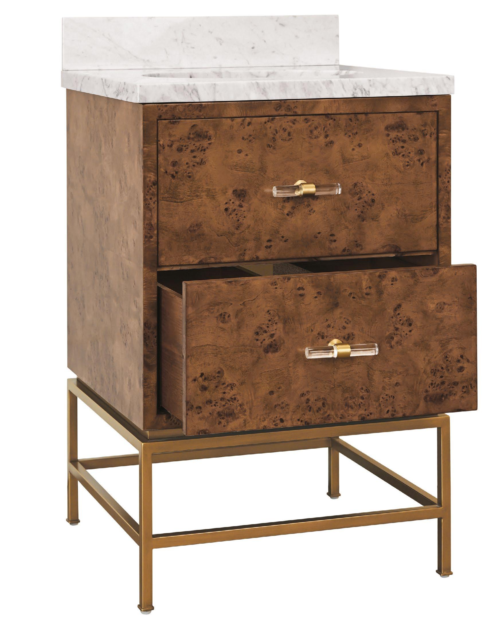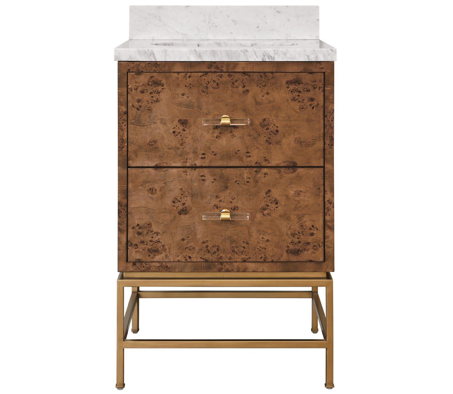 Amp up your powder room with our extraordinary Clifford 24 DBW bath vanity. This Mid Century mod stunner features a dark burl wood drawer with lucite & antique brass door pulls. The case floats atop a sturdy, antique brass metal base and includes a luminous white and grey Carrara marble top and backsplash, plus a white porcelain sink.