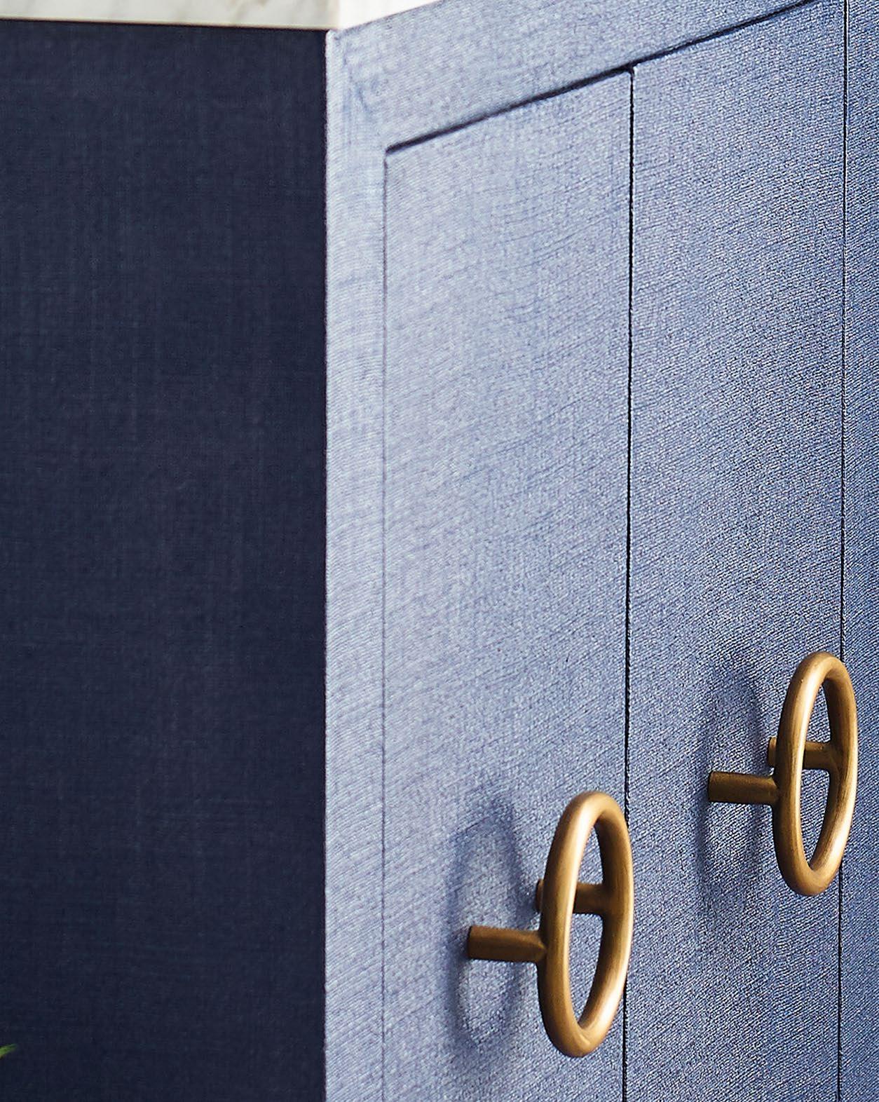 You’ll want to design your bath or powder room around the high style material palette of our Blanche bath vanity. Dressed in matte burl wood (BW) or textured navy linen (NVY) along with its antique brass ring pulls, the Blanche is an artful combination of color and texture. Included are a luminous white and grey Carrara marble top and backsplash plus a white porcelain sink.