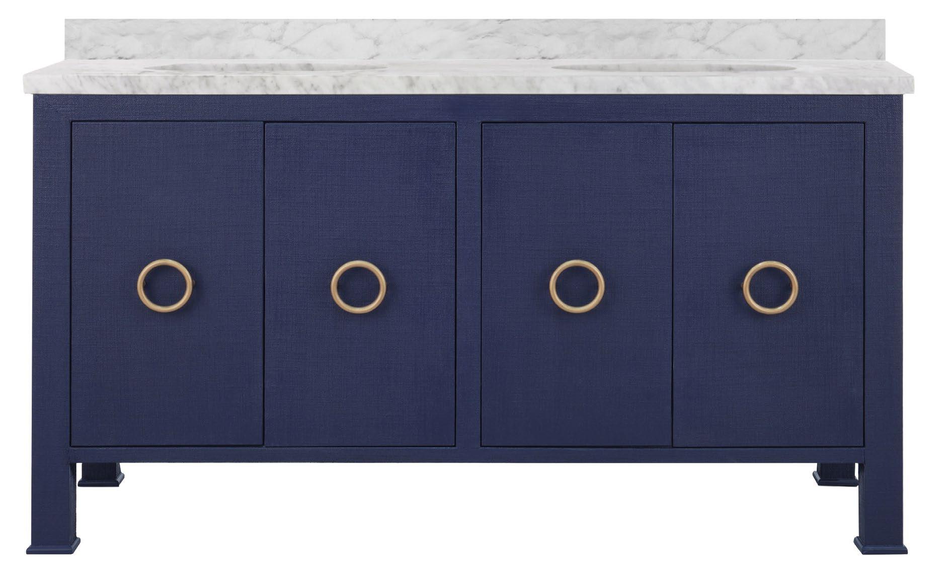 You’ll want to design your bath or powder room around the high style material palette of our Blanche 60 NVY double bath vanity. Dressed in textured navy linen along with its antique brass ring pulls, the Blanche 60 NVY is an artful combination of color and texture. Included are a luminous white and grey Carrara marble top and backsplash plus two white porcelain sinks.