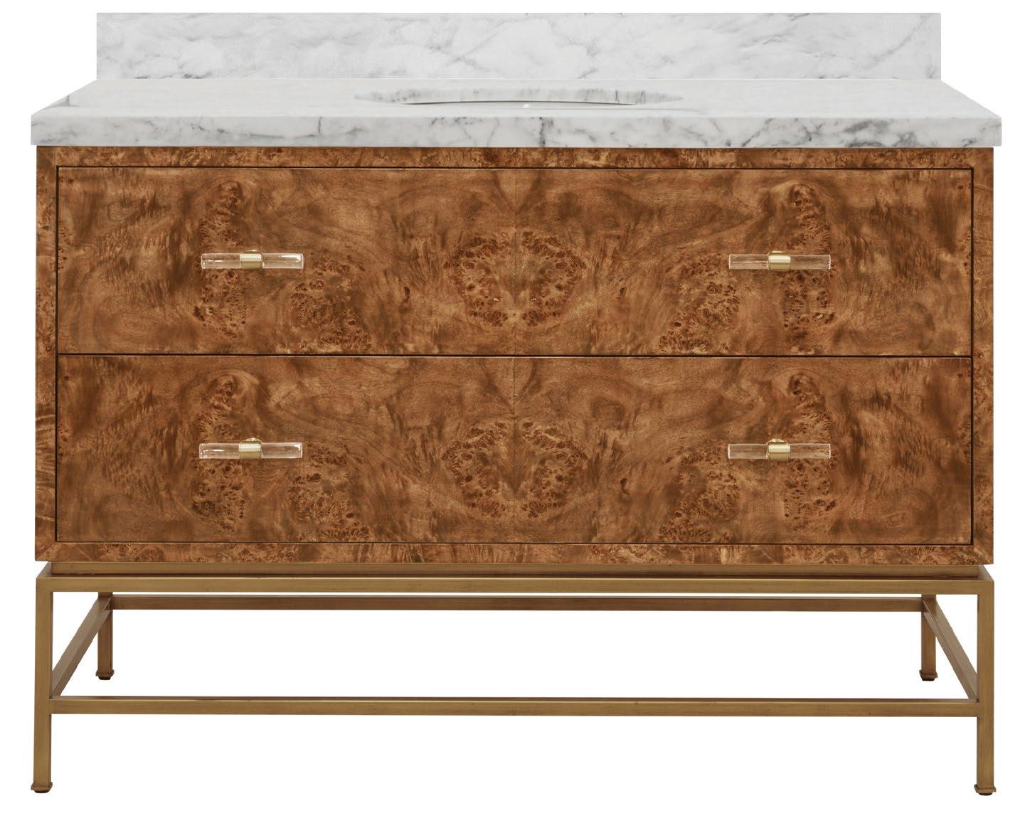 Amp up your powder room with our extraordinary Clifford 48 DBW bath vanity. This Mid Century mod stunner features a dark burl wood drawer with lucite & antique brass door pulls. The case floats atop a sturdy, antique brass metal base and includes a luminous white and grey Carrara marble top and backsplash, plus a white porcelain sink.