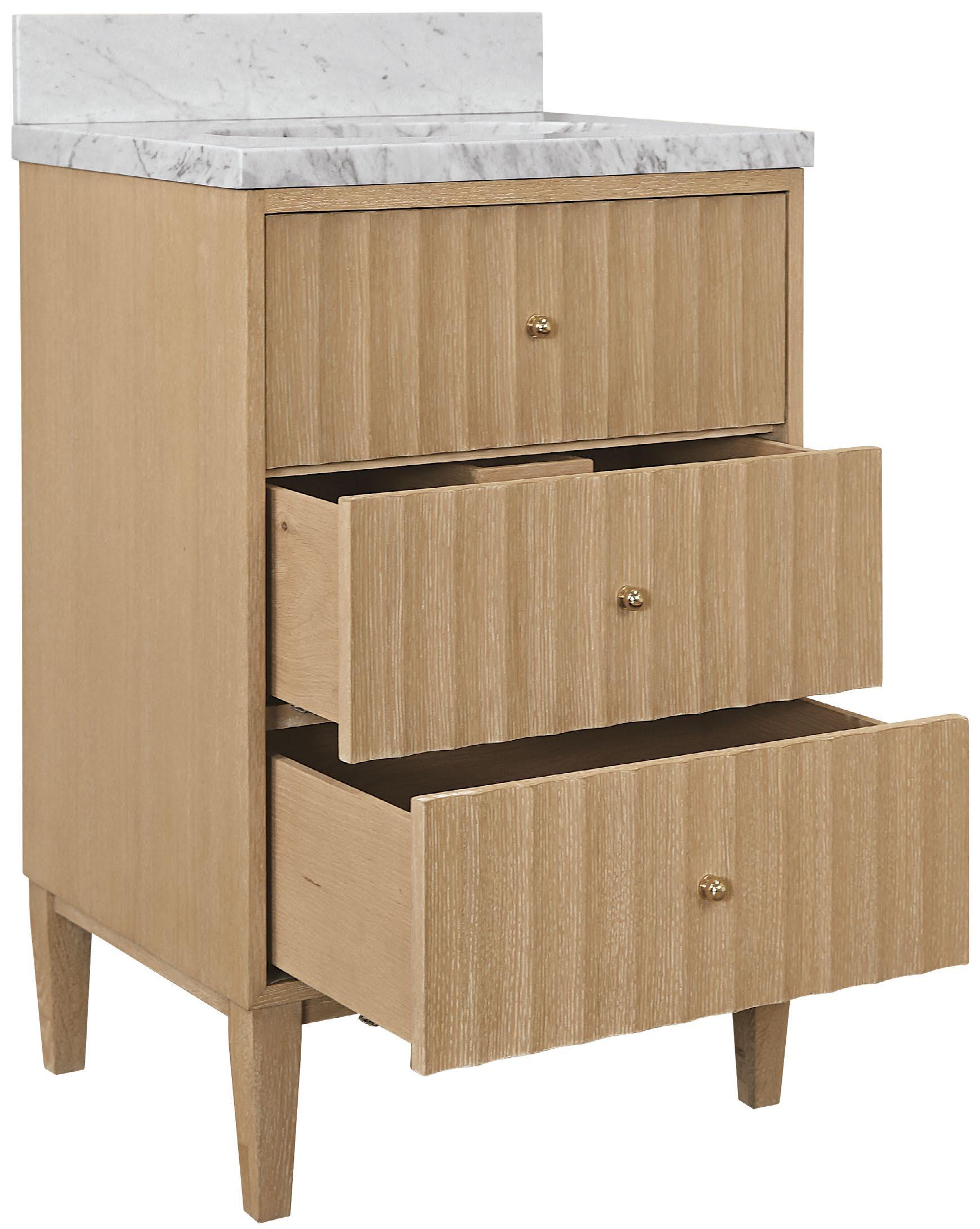 Offering both Ancient Greek details and an organic finish, the Odin 24 CO will transform your bath or powder room into a haven! Employ the polished brass knobs to gently open and experience the smooth functionality of the soft-close feature on each of the two working drawers. Crowning the natural cerused oak base is a white and grey Carrara marble top and backsplash seamlessly integrated with an attached white porcelain sink.