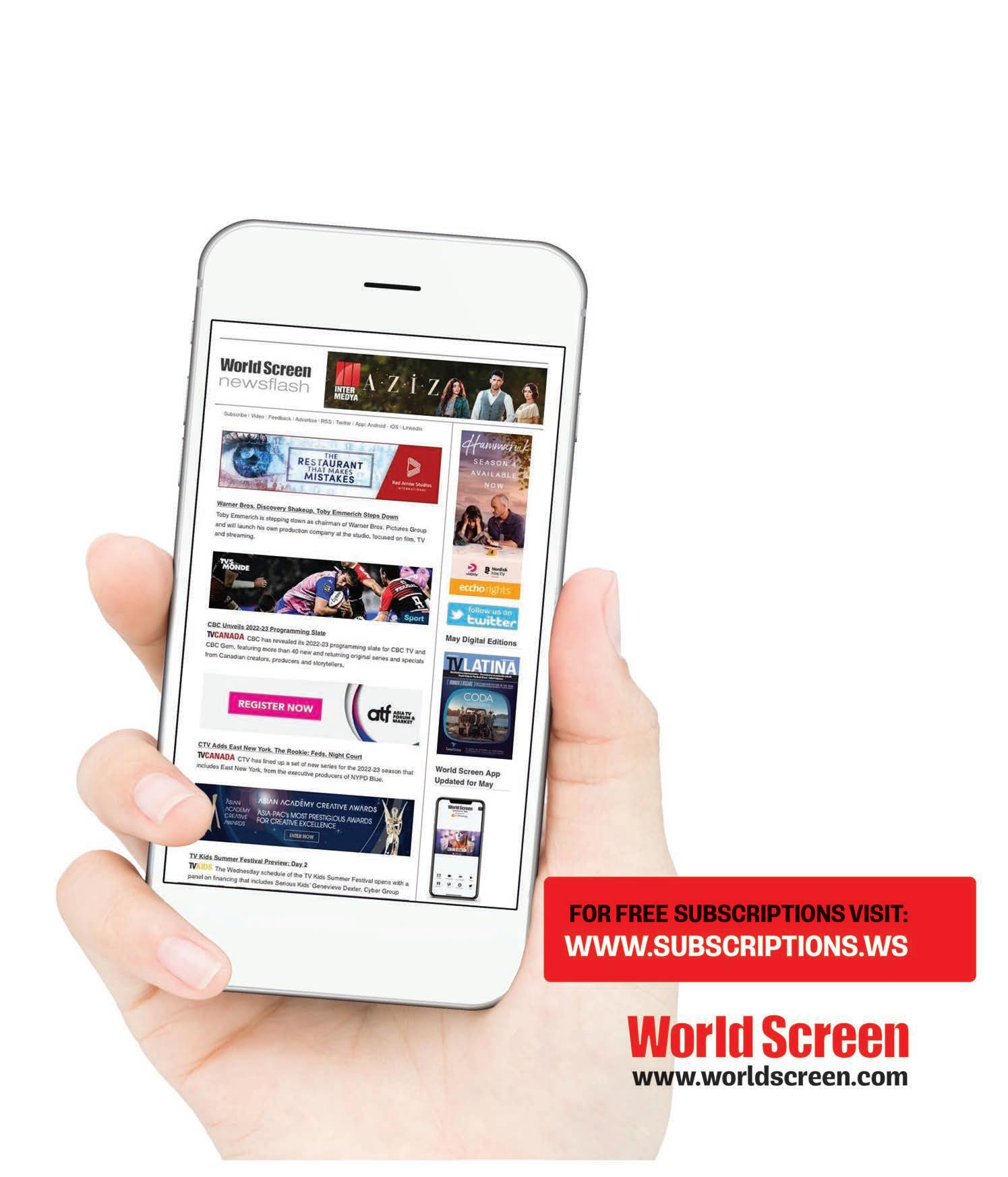 WORLD SCREEN is a registered trademark of WSN INC., 1123 Broadway, Suite 1207, New York, NY 10010, U.S.A. Phone: (212) 924-7620 Fax: (212) 924-6940 Website: www.worldscreen.com ©2022 WSN INC. No part of this publication can be used, reprinted, copied or stored in any medium without the publisher’s authorization. For a free subscription to our newsletters, please visit www.subscriptions.ws.