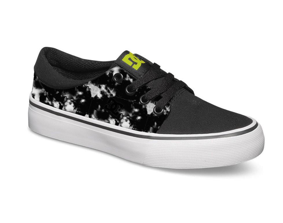 Capellada de textil sublimado + Calce tipo slip-on + Logo lateral en grifa + Aplicación de marca en lengüeta + Construcción vulcanizada + Suela de caucho resistente a la abrasión + Diseño de pisada “Pill Pattern” de DC.