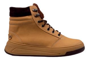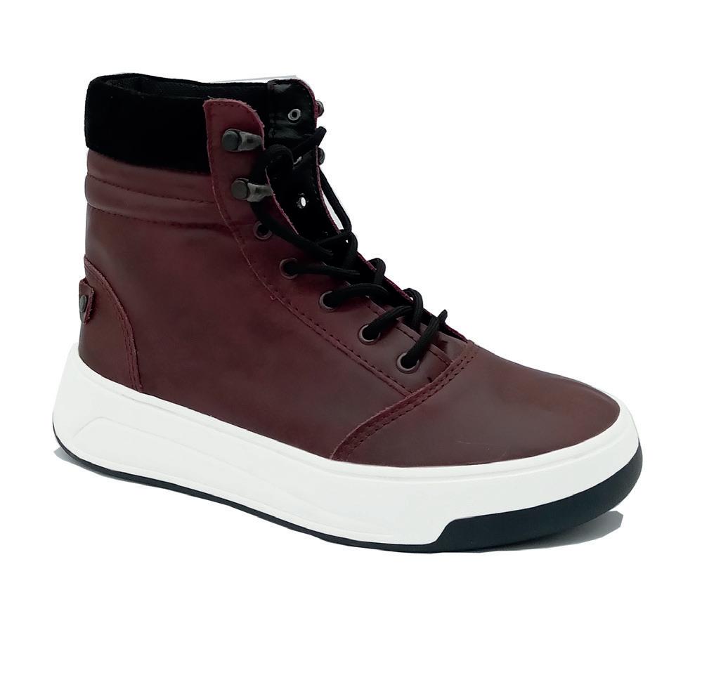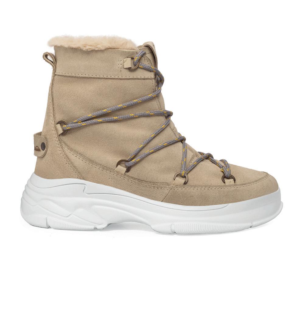 • Bota de media caña realizada en descarne Detalle de lengüeta en Sherpa Suela de eva inyectada de bajo peso para un mayor confort Aplicación de marca grabada en descarne Cordón redondo bitono