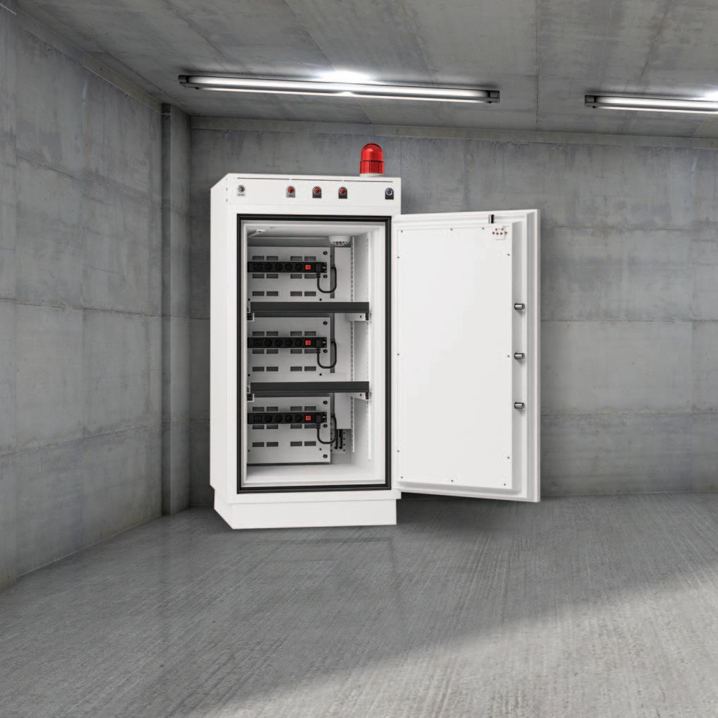 Select the Battery Fighter Series for unparalleled peace of mind, featuring a robust double-wall construction that is fire and impact rated. Choose from three size variations with key or electronic locking mechanisms, integrated smoke sensors, and power outlets incorporated.