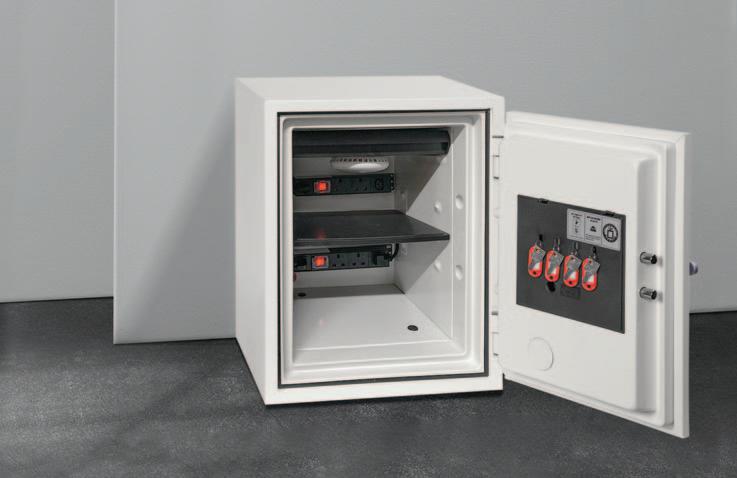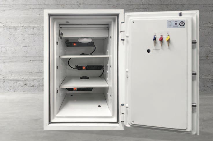 Customers can select from six size options, each offering either key or electronic locking mechanisms, integrated smoke detectors, reinforced insulated shelving, and built-in power outlets. Furthermore, this range includes a plinth for effortless relocation and removal from the premises in case of a fire emergency.
