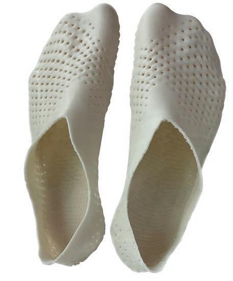 The founders behind US start-up Simplifyber are on to this, having patented both a new material stream and way of manufacturing. The feedstock is a cellulosebased slurry made from waste from the wood industry, but can include everything from recycled paper to waste wool or materials, such as hemp. Co-founder Maria Intscher-Owrang worked as a high-end fashion designer for more than 20 years, but was unhappy with the level of impact she was having. “I wanted to find a way to make natural fibres cost competitive, so this system shortens the supply chain so that it’s more efficient and more automated, and that cuts the cost of the manufacturing,” she explains. “We use the materials when they’re at the beginning of the supply chain, so they’re the cheapest they’ll be. That combination makes our unit economics work better than plastic when you hit the thousands of products. Even taking into account the cost of moulds and tooling, it becomes cheaper. I really think that’s the only way we’re going to change the industry.” The company works with footwear factories and sole suppliers near its base in North Carolina, US, to offer a full shoe. The uppers can be coated with various finishes to make them durable and waterproof. It aims to provide its slurry and machinery to manufacturers globally, so local supply chains can be set up and use waste from different industries to create the upper.