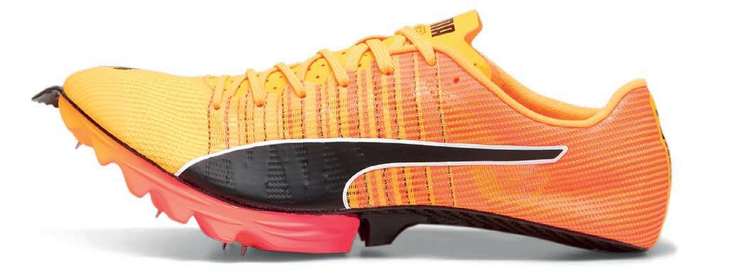 Puma put extensive thought into the evoSpeed Berserker Nitro Elite Spikes. The brand’s vice-president for innovation, Romain Girard, points out that this product combines “the best of Puma’s technologies”. He lists the group’s nitrogen-infused thermoplastic foam Nitrofoam Elite, its Pwrplate carbon fibre plate, which is engineered to stabilise the midsole while maximising energy transfer, and its Ultraweave upper material. “The technologies are combined in a revolutionary way,” Mr Girard tells World Footwear, “allowing a huge improvement in energy return at each step, from the first touchpoint moment to the last millimetre before taking off.”