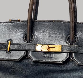 Birkin 35 and the depth of the Birkin 40. The shoulder-strap on the prototype is non-removable and the support studs on the bottom are smaller than in the now established design. It also has Jane Birkin’s initials embossed into the box calf leather, immediately below the main metal clasp.