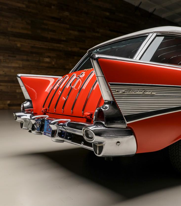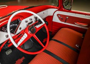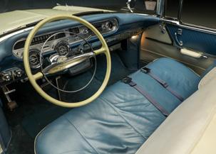 to all of the appointments such as push-button radio, heater-defroster, back-up lights, dual exhaust, and little things like the fingernail guard for the fuel door, bright rocket panel moldings, under-dash tissue dispenser, and the unique Guide Traffic Light Viewer. The workmanship is top-shelf all the way on this car, with excellent body panel alignments, doors that open and close with ease, and under-hood detailing showing off that wonderful V-8 engine, complete with the oil-bath air cleaner. Full optional wheel covers accompany a set of 6.70” X 15” wide whitewall tires that look fresh and new. With the turn of the key, this Chevrolet comes alive and, with you behind the wheel, you too can experience the thrill of seeing the USA in your new Chevrolet.