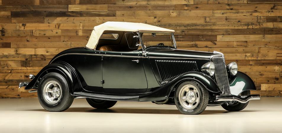 added. Custom-made aluminum heads produced by the legendary Kong Jackson were created just for this car and topping off the build was a Thickstun aluminum intake manifold. Ensuring easy starts was the MSD electronic ignition system along with a set of vintage Fenton headers located and bolted into place finishing off with a pair of Stromberg 97 carbs. A set of original Halibrand magnesium knock-off wheels were located and fitted with Michelin tires all around 165 SR/15” up front and 235 R/15” to the rear. Seating surfaces were supplied by LeBaron & Bonney with brown leather, including the fold-down rumble seat and a restored set of instruments was installed in the professionally woodgrain dashboard. This car was acquired by the Haag Collection in 2011 after it had been in storage for about 12 years. It was carefully reawakened and made roadworthy. According to the odometer, it appears to have been driven just under 4,200 very careful road miles. This is one car that the more you study it, the more you will come to appreciate little things like the pop-out windshield, the clear glass wind wings, the feel and fit of the door panels, or just the stance of the car. Under the hood is an awesome sight, especially those massive Kong aluminum heads and the dual carb setup. This is one of the most attractive roadster rods we have ever offered and one that you will be proud to own, drive and display.