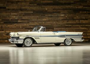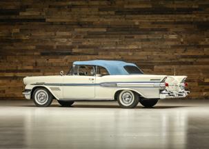 Finished in Kenya Ivory with Fontaine Blue two-toning in the side spear, this is one of the finest examples of the remaining Bonneville convertibles. Matching the exterior color scheme, the handbuffed leather seats are also in blue with white accents and most special was the blue folding soft top with matching boot. In addition to all of the power equipment which was standard, such as