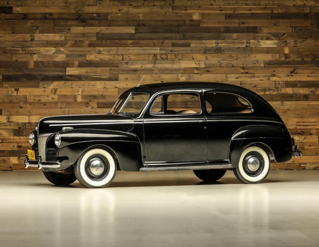 This Tudor sedan was spared from the scrap piles during the war and in the mid-1970s was given a custom build with design and elegance that is timeless. All original steel panels were kept with the car and painted a deep and lustrous black lacquer and feature subtle blue pinstriping along the beltline of the body.