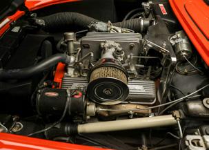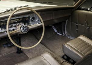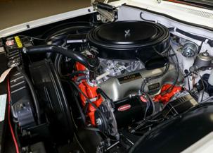 four-speed transmission connected to a Positraction rear axle. Affixed to the firewall is the original build tag showing paint color 936, indicating it left the plant in Ermine White. The same tag shows interior trim code 872 indicating the red vinyl and fabric interior. During the restoration, strict attention to detail was paid to even the little items and Seville grain vinyl was used for seating surfaces and door panels. There are a few accessory items such as the tinted windshield, padded instrument panel, heater-defroster, two-speed windshield wipers with washer system, back-up and luggage compartment lights plus the outside rearview mirror and inside non-glare mirror.