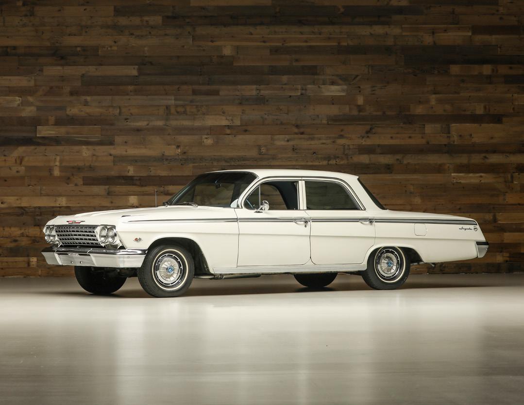 as crate motors. In 1962, thousands of car-crazy teens learned all the values of Chevy’s big 409 V-8 thanks to the Beach Boys who in their song would immortalize this powerful engine, for it was so fine. For 1962, full-size Chevrolets were offered in three trim levels, the Biscayne for fleet owners and budget-conscious buyers, the Impala for those who wanted a lot of glitz and chrome trim, and the Bel Air which featured well-appointed basic sedans and a hardtop, and were often the recipient of one of these mighty engines. In quarter-mile competition, the Turbo-Jet V-8 provided an extreme amount of body twisting torque, so to combat body flex and provide better stability on the track, the two-door post sedan was the racer’s choice.