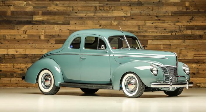 coated headers, 12-volt electrics with alternator and modern R134A air-conditioning. During the build, no holes were cut, and no hoses were visible; it is like Tim says, “Sneaky”. Starting with an original all-steel body and fenders, it was refinished in what Ford called “Cloud Mist Gray”. In reality, it was a pleasant medium green that was so popular when this coupe was new. Original style trim was used in the build to maintain that stock appearance. Underneath, the original frame was retained given many modern upgrades from the rear-axle setup to the four-inch dropped axle, an original 1940 Ford sway bar with Heim joint end and a disc brake conversion that look pretty stock.