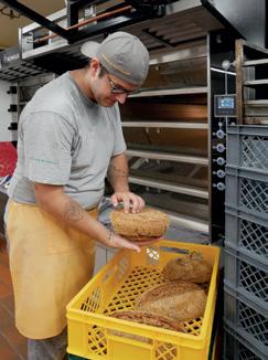 Alles in Allem werden mit der „Ferka“ täglich 420 Kilo Getreide verarbeitet. Neben der Mühle gibt es auch noch eine Roggenquetsche. „Die gequetschten Körner werden im Quellstück für das Roggenfein und für die dritte Stufe unserer langen Sauerteigführung einge setzt“, so Oliver Grube. Diese dritte Stufe der Teigführung ist wichtig für Frische, Milde und Volumen der Brote. Die Arbeit mit einer eigenen Mühle birgt für unsere Bäcker stets neue Heraus forderungen. „Wir arbeiten mit dem Getreide, dass auf dem Hof geerntet