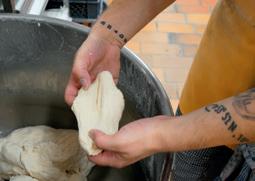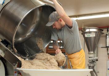 Der erste Blick gilt dem Backzettel. Er gibt dem Teigmacher die tagesaktuellen Produktionsmengen für die einzelnen Brote und Brötchen sowie die dafür erforderlichen Zutaten an: Mehl, Wasser, Vorteig und Saaten wie zum Beispiel Amaranth. Die Produktmengen variieren von Tag zu Tag, so dass der Backzettel stets neu erstellt werden muss. Christian startet mit dem DinkelSauerteig. „Die Zutaten haben wir schon am Vortag vorbereitet. Durch die Schlagkraft des großen Abwiegers, der die richtige Teigmenge für die einzelnen Brote am Tisch portioniert, würde ich sonst nicht hinterherkommen,“ erklärt Christian. Als zweites wird der Teig für das Arche Warderbrot hergestellt, dann folgt das Dinkel-Hafer.