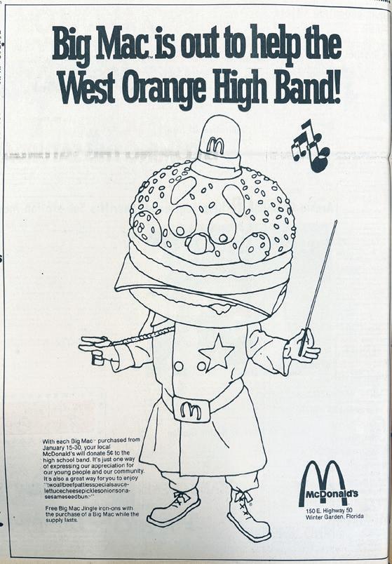 West Orange High School band members benefited from local residents’ obsession with McDonald’s. An advertisement in the Winter Garden Times featured Mayor McCheese with a conductor’s baton in his hand and several musical notes near his cheeseburger head.