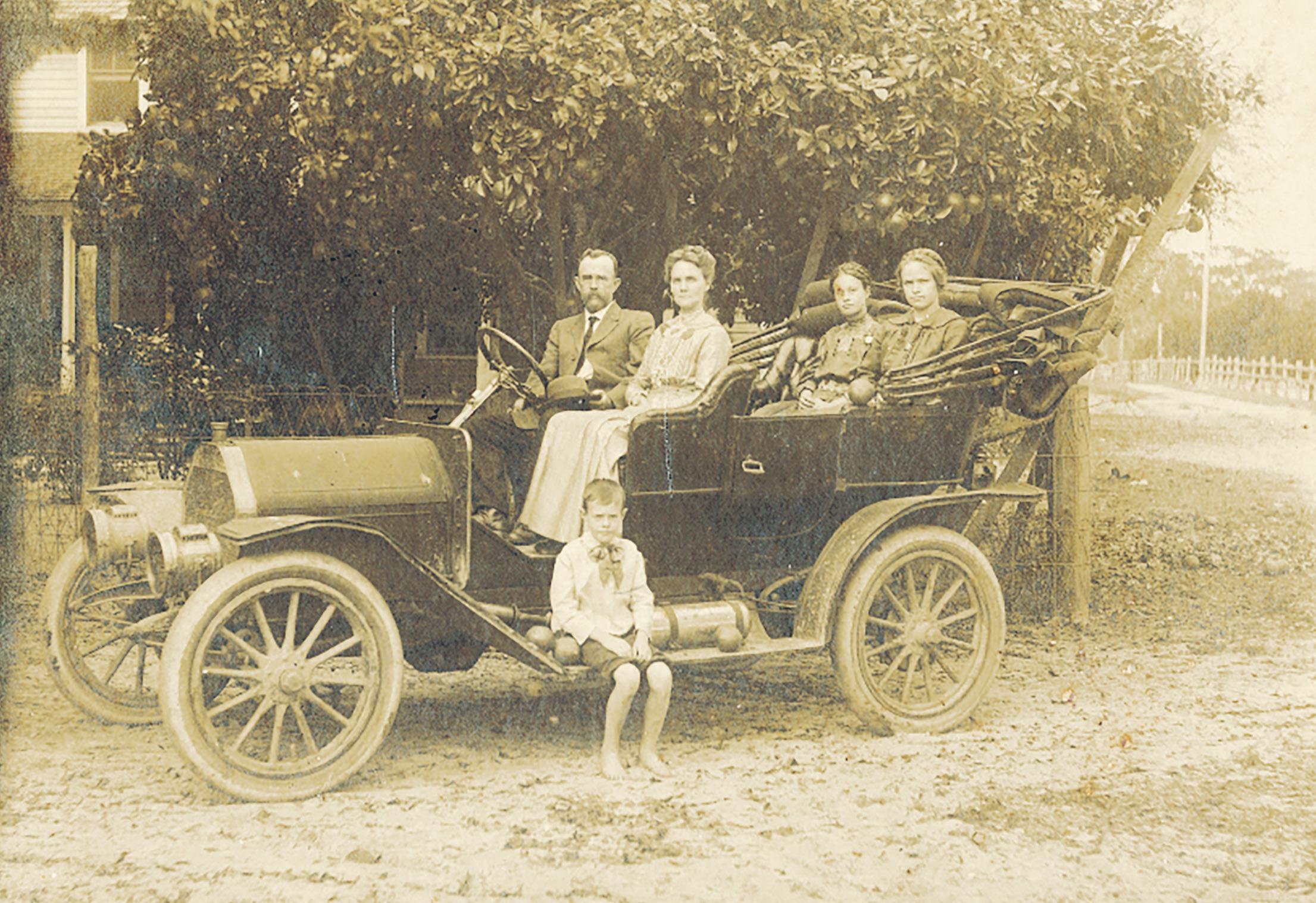 Many of the streets in Winter Garden are named after local families who left their mark on the development of the city. Pictured are W.L. Story; his wife, Mattie; and their children, Kate, Lena and Bill. They posed for this portrait with the family car in March 1913 at the southwest corner of Story and Kate S. Burch roads, where their home stood. The latter byway, which once ran from Plant Street south along the west side of today’s Hyde Park, no longer exists. Story Road was renamed for the family, originally having been known as Washington Street, which was itself an extension of the street in Orlando that bears the same name. The road originally was platted as State Road 22 and ran from Indian River City on the east coast to well past Clermont.