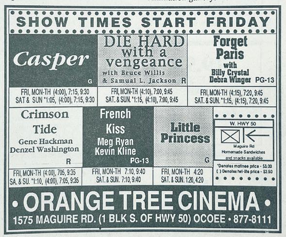 Winter Garden and Ocoee boasted several movie theaters in 1995, and two advertised regularly in The West Orange Times The Star-Lite Drive-In, on East Plant Street in Winter Garden, offered movies for $1.50 per person — or $1.50 for an entire carload of folks on Tuesdays. In a newspaper advertisement, the drive-in featured “Major Payne” and “Streetfighter” to moviegoers, and anyone who cut out the ad and took it to the box office received a free admission with each paid ticket. At Orange Tree Cinema on Maguire Road in Ocoee, film fans had a choice of “Casper,” “Die Hard with a Vengeance,” “Forget Paris,” “Crimson Tide,” “French Kiss” and “Little Princess.” Matinee movies were $3, and twi-lite films were $2.50.