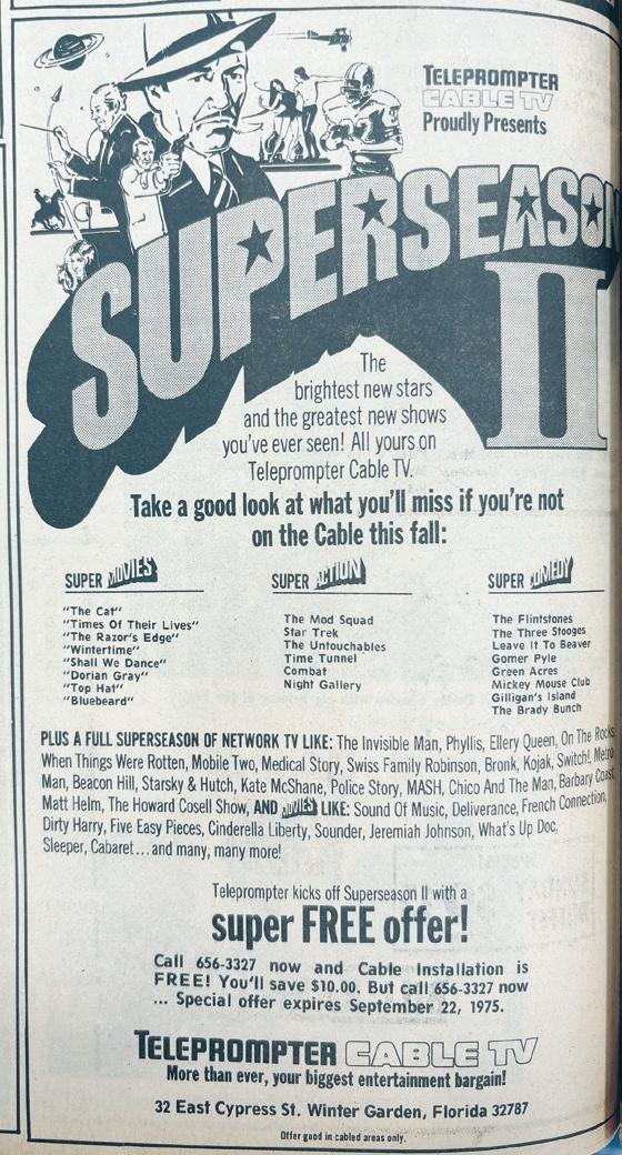 TelePrompTer was an independent media company, in competition with Cablevision, that offered television viewers the chance to watch more than just the Big Three national commercial broadcast networks. Some markets even offered the Home Box Office service. The local market advertised in The Winter Garden Times an exciting lineup of cable shows for the fall “Superseason II”: movies, such as “The Razor’s Edge,” “Dorian Gray” and “Bluebeard”; action shows, such as “The Mod Squad,” “The Untouchables” and “Star Trek”; and comedies such as “The Three Stooges,” Leave it to Beaver,” “Mickey Mouse Club” and “The Brady Bunch.” Of course, network television still provided the regular shows, such as “The Invisible Man,” “Swiss Family Robinson,” “Starsky & Hutch” and “Chico and the Man.” The cable company was located on East Cypress Street in Winter Garden.