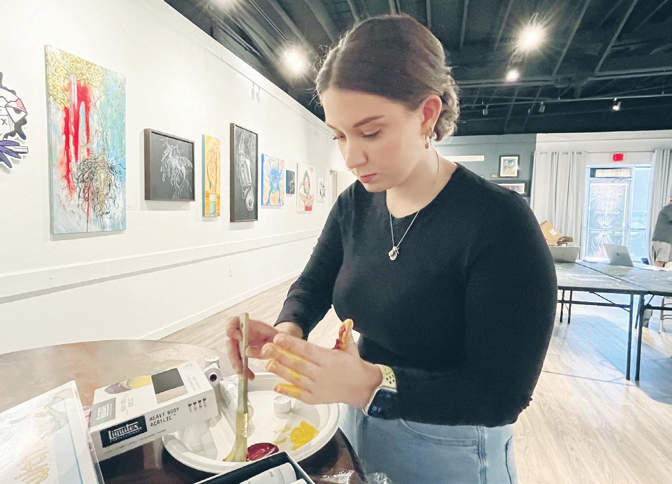 Victoria Pestrichello, a UCF student, covered her hand in red paint and went over to the collaborative artwork she and other members of the Young Creatives Showcase were working on at SOBO Art Gallery.