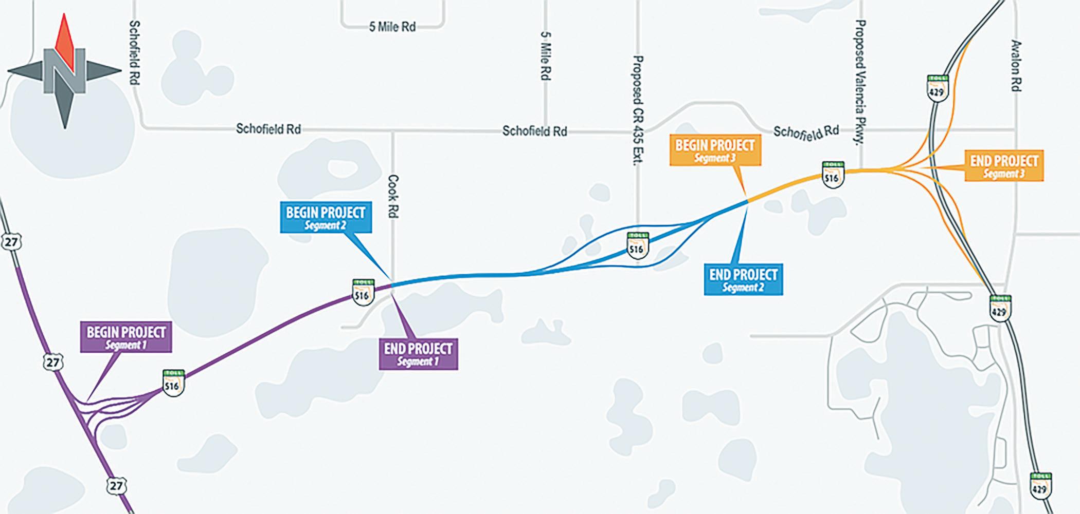Construction on the first section of the project, from the Lake/Orange County line to State Road 429 just south of Schofield Road, will begin in May. Construction on the remaining two segments is anticipated to get underway later this year.