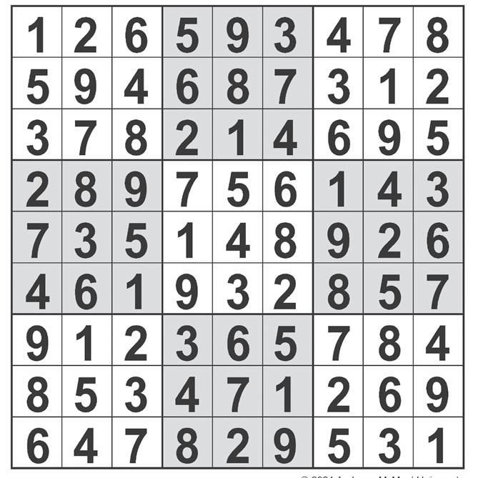 tised in The Winter Garden Times its annual anniversary sale with bargains galore. Deals included a gentleman’s 17-jewel self-winding calendar dial watch and ladies’ elegant 17-jewel bracelet watch, each for $29.99; an eight-diamond bridal pair of rings, in 14 karat in white or yellow gold, totaling one carat for $269.99; sterling silver charms priced from 99 cents to $1.49; and birthstone and pearl rings at one-third off regular price. The jewelry store was located in the Ocoee Shopping Center. celebrity cipher sudoku Complete the grid so that every row, column and 3x3 box contains every digit from 1 to 9 inclusively. ©2023 Andrews McMeel Syndicate crossword ©2023 Universal Uclick ACROSS 1 Enjoy some gum 5 Cakewalk, in sports 9 Best Western competitor 15 Mope 19 Citizenship ceremony recitation 20 Olympics site in 2002 21 White House occupants from 2009-2017 22 “And furthermore ...” 23 Jai ___ (fast-moving court game) 24 Banned behavior 25 *Earwax, perhaps? 27 Buttonhole, for example 28 Avian abode 29 “The Loco-Motion” singer Little ___ 30 Nautical chart 31 *Eleanor and Chidi on “The Good Place,” for one? 36 Big battery 37 Solo of “Star Wars” 38 “Hooray, Jose!” 39 Poppycock 41 Far from feeble 44 A little shut-eye 45 Jason’s wife, in Greek mythology 47 For now 48 *What the toddler did when he fell? 55 Close friends, in modern slang 56 Attorneys’ grp. 59 Bad look 60 “Just Do It” logo 61 “Most certainly!” 64 Basketball venue 67 Joined 68 *Limited edition Seinfeld show? 72 Check one’s math, in a way 75 Big name in kitchen wrap 76 Skipped seconds, perhaps 79 Mint in a tin 81 Give off, as an odor 83 Actor Cage, familiarly 84 Choose 86 *Request from an unhappy partner? 90 Some lip service? 93 Doesn’t hold water? 94 Afternoon brew 96 The end of time? 97 “Oh totes, me, too” 102 Your, in France 103 Add-on charge 104 Acrobatically gifted 105 *Sleeping Beauty’s prince falling into Maleficent’s trap? 113 Careless 115 Issa ___ of “Barbie” 116 A real hip dance? 117 Forest trail 118 *A particular fairy’s occupation? 121 “House” actor Epps 122 Big on 123 Clever scheme 124 Agree (to) 125 Give out, as library books 126 Adam and Eve’s paradise 127 LAX approximations 128 Whodunit feature 129 Ballpark figs. 130 Barely grilled DOWN 1 Breeze along 2 “Catwoman” star Berry 3 Amazon’s business category 4 Super-sizzling 5 Vice-presidential hopeful 6 Plains tribe members 7 Superstar’s home, often 8 Place for a shot in the dark? 9 After-bath garments 10 Higher than 11 Annoyed with 12 “American Hustle” actress Adams 13 Dance move that exploded in popularity in 2015 14 Big brand in laptops 15 Royal abode 16 They’re grumpy, in a classic 1993 movie 17 Regular bar orders 18 Knock over 26 Roadside dangers in war zones, for short 32 Rooftop rooster 33 Country between China and India 34 “Go back,” on an edit menu 35 Burns or Frost 40 Captures 41 Banana Boat tube initials 42 Airline seat feature 43 All roads lead to this, some say 45 “SNL” alum Mike 46 “Snowy” marsh bird 49 Coffeehouse poet 50 Bad, and then some 51 It’s sportier than a sedan 52 Big blows, for short 53 Be a consumer 54 Degree for a prof 57 Containers 58 Cambodia’s continent 62 Ancient sinful city 63 Alternative music song, perhaps 65 Indian flatbread 66 Against 69 Homer’s language 70 Gaza group 71 Poker pack 72 Car wash item 73 Manning who won two Super Bowl MVP awards 74 Bread source (Abbr.) 77 “Meh” 78 Contractor’s detail, for short 80 “Basket of Bread” painter 82 ___-frutti (ice cream flavor) 85 “For shame!” 87 Arcade game sound 88 Problem for some newborns 89 Front door security feature 91 “Cake Boss” competitor, often 92 More heavy-eyed 95 Takes for granted 97 “Hell is other people” philosopher 98 Get too old, as for foster care assistance 99 Boozy brunch drink 100 High society 101 Informal meeting 106 Bothered 107 Magna cum ___ 108 Biblical outcast 109 Bias 110 “A Fish Called ___” (1988 comedy) 111 Express aloud 112 Cellular device 114 Blocked email, often 119 Critical hospital dept.