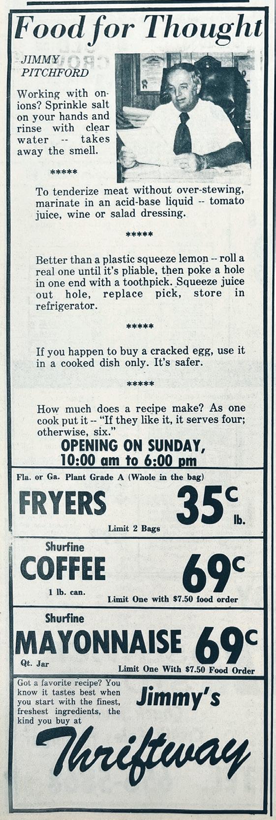 Jimmy Pitchford, owner of Jimmy’s Thriftway grocery store in downtown Winter Garden, ran a weekly advertisement in The Winter Garden Times. He shared a few of the week’s specials as well as his Food for Thought, which was a collection of kitchen tips and hints. In 1974, Pitchford suggested the following: To rid your hands of the smell of onion, sprinkle them with salt and rinse with clear water. To tenderize meat without over-stewing, marinate in an acid-base liquid, such as tomato juice, wine or salad dressing.