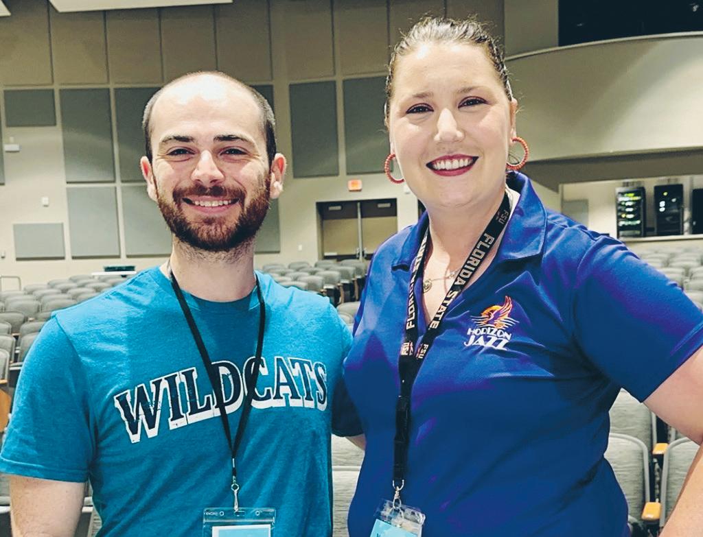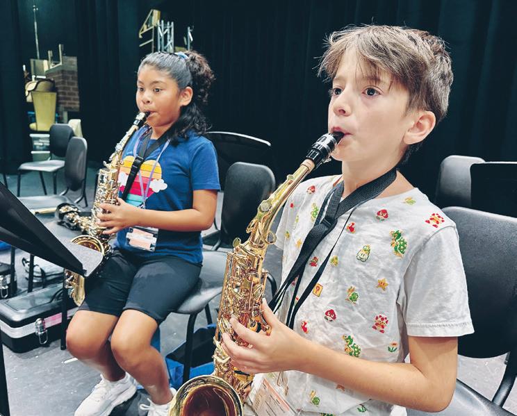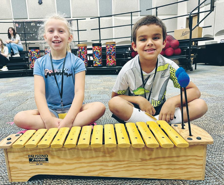 Eric Olsen, band and orchestra director at Water Spring Middle School, instructed the beginning band camp members. Madison Jackson is one of the students in the beginning camp. Below: More than high school students volunteered at the music camp. Beginning band camp members Ruby Aguirre, left, and Finn Davis practiced their instruments together. Right: Eric Olsen, left, band and orchestra director at Water Spring Middle School, and Charlene Cannon, Horizon High School band director, helped lead classes. Color guard cadet camp members Sophia Silva, left, and Bronte Groeninger stopped for a quick picture during practice. Right: Elementary music camp students Adilyn Bullman, left, and Pedro Arreaza practiced the xylophone.