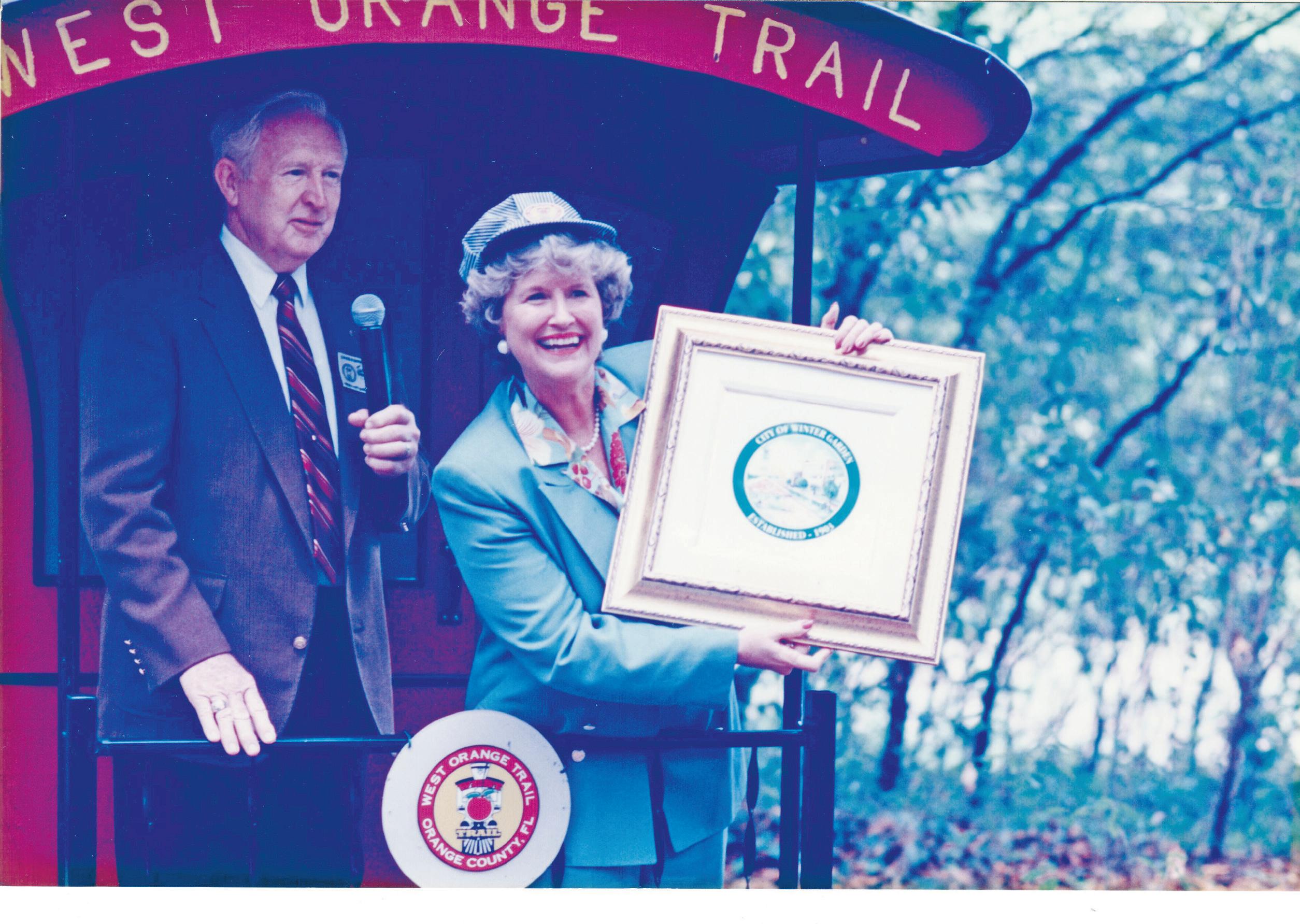 On June 12, 1997, Winter Garden Mayor Jack Quesinberry and Orange County Mayor Linda Chapin celebrated the extension of the West Orange Trail. The setting is Clarcona, a rural village whose name evolved from Clark’s Corner; William N. Clark was significant in organizing this community. The West Orange Trail, a project dear to the hearts of many city and county officers, helped spark the revival of Winter Garden’s downtown historic district when it opened in the fall of 1994.