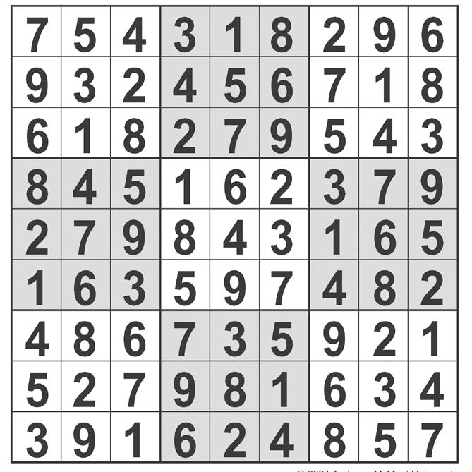 FROM THE ARCHIVES celebrity cipher sudoku Complete the grid so that every row, column and 3x3 box contains every digit from 1 to 9 inclusively. ©2024 Andrews McMeel Syndicate crossword ©2024 Universal Uclick ACROSS 1 Parisian sandwich cookie 8 Vampire feature 12 Oaf 16 Smallest denomination of U.S. coin ever minted 17 Justice Sotomayor 18 Improves, as a skill 20 *Keep Ray Davies and co. in shape on tour? 22 Like Machu Picchu 23 Oscar winner Stone 24 Eastern “way” 25 Actor White who played Steve Urkel 26 String quartet instrument 27 Meadow 28 Implore 29 One dealing with pet peeves? 30 Draft ___ (valuable sports commodity) 32 Opposite of ‘neath 33 Jalopy, e.g. 35 *Hustle to get Robert Smith and co. their gear before showtime? 39 Citrus-flavored cocktails 40 Endure 41 NYSE debut 42 How SNL has aired since 2005 43 *Shuttle Ann Wilson and co. to the venue? 45 “Pass” 46 Feasted 49 Homer’s “neighborino” 50 Caustic compound 51 Departure areas 53 Lunch order that’s pressed for time? 54 Dust Bowl migrant 56 Fancy 57 Grow dark 59 Jan. 1 preceder 60 *Provide Pat Monahan and co. a place to stay on the road? 64 *Make sure Eric Clapton and co. are illuminated on stage? 66 Greyhound, e.g. 67 Like some survey questions 68 Place for a raft 69 Device with many touch points? 70 Showy tufts 72 “Ick!”-eliciting 74 “That’s a mental image I didn’t need” 75 Abbr. on some chain emails 78 “We concur” 79 Corncob holder 80 *Tow Freddie Mercury and co.’s broken-down tour bus? 83 Scam 85 “___: Vegas” (2021 TV reboot) 86 Bump off 87 Don Juan declaration 88 *Encourage Jim Morrison and co. to freely express themselves? 92 One experiencing the daily grind? 93 Pound outburst 94 “Hasta la vista!” 95 Montevideo Mrs. 96 Dine 97 Bit of ink 98 Unflappable 100 Babbling streams 103 “___ corn!” (2022 viral video) 104 “Sorry, wrong” 105 ___ Haute, Ind. 106 *Temporary fix ... or a description of seven answers in this puzzle 109 Fires 110 Bugs’ predator? 111 Mudslinger, maybe 112 Target of the KonMari Method 113 Barely passing grades 114 Regular on the social circuit DOWN 1 Slobberer of the comics page 2 ___-Seltzer 3 Corp. money manager 4 More sharp 5 Mark down, say 6 Not fooled by 7 To the ___ degree 8 Thwart 9 Wife II or IV for Henry VIII 10 Clothing line for serious athletes 11 Manipulated into secondguessing 12 Wedding playlist staple also known as “Der Ententanz” 13 Only 14 Elated 15 Hand holder? 16 Big domestic liability 17 Put it on ice! 19 Saw logs 20 Words of the vanquished 21 Button in Bond’s car 28 Gala 29 Widespread 31 Greek “X” 34 Things to believe in 35 Like white peacocks 36 Decree 37 “Hamlet” love interest 38 Double feature? 40 Baklava has many of them 44 In groups 45 Pester 47 “Only Time” singer 48 Per ___ (travel allowance) 51 Gimlet spirit 52 Slump 53 Teacup, say 55 Self-help book pointer 56 Bishop’s locale 58 Personification of authority, in slang 60 Howard University, for one (Abbr.) 61 Yours and mine 62 Noted advice from ObiWan Kenobi 63 “Knives Out” actor de Armas 64 Showed the way 65 Tank up 68 Title for Paul McCartney (but not John Lennon) 71 Anytime now 73 Sneak attack 74 Multisport races, briefly 76 Having deeper pockets 77 Look 80 Explorer of kids’ TV 81 Big name in swabs 82 Boxing champion Ken 84 ___Pen (lifesaving tool) 85 Bach piece 86 Latissimus ___ (back muscle) 88 Brewery kilns 89 Celeb’s spin class? 90 Like some well-organized binders 91 Schindler of “Schindler’s List” 92 Lightweight cotton 96 Vodka brand, informally 99 Rankles 101 “This round is ___!” 102 Praiseful poems 103 Middle of Caesar’s boast 104 ___ Reader 107 Messages on Insta, say 108 Fleecy boot