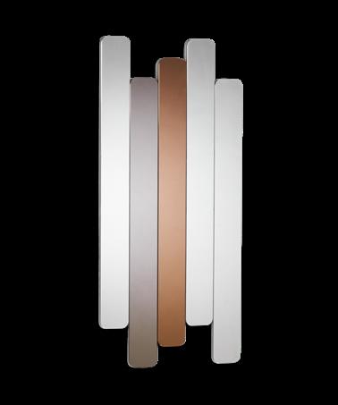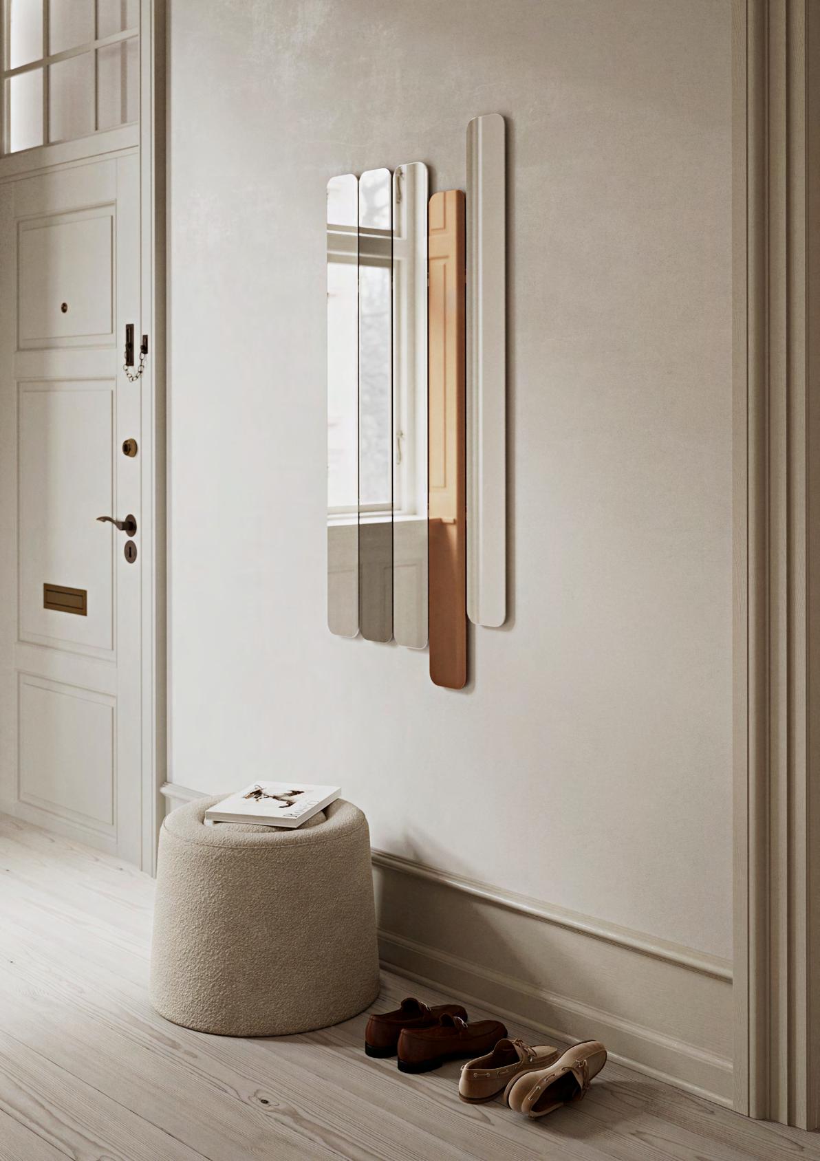 The name ‘Logs’ stems from the designer’s source of inspiration, found in the calmness of the Nordic birch forests. Embodying the repetition of numerous trees, this aesthetically versatile piece echoes the identical shape of the mirrors. Simultaneously static yet softly organic. The individual mirrors can be placed at different heights to obtain a wavy effect, allowing you to construct a personalised expression. From artistic creations to balanced appearances.