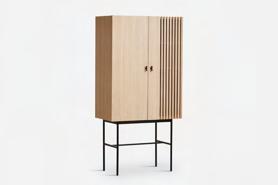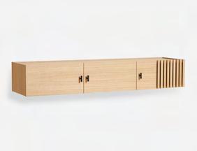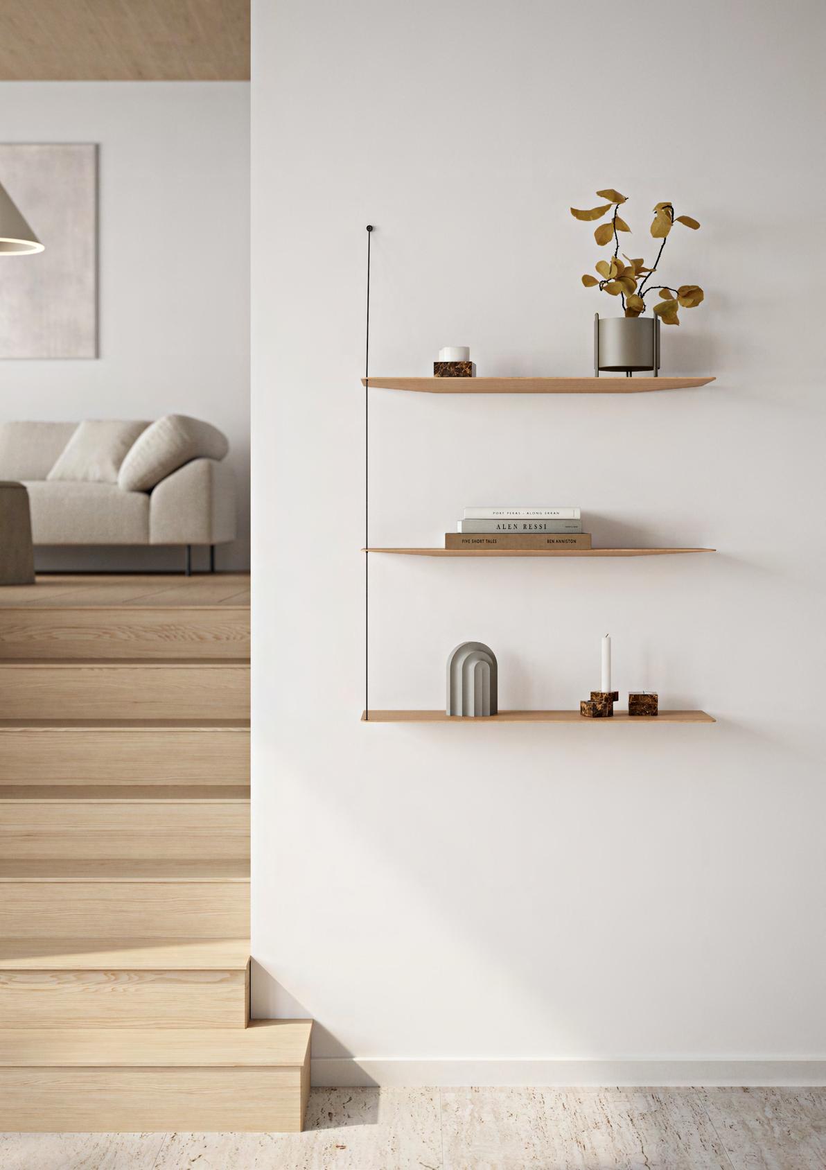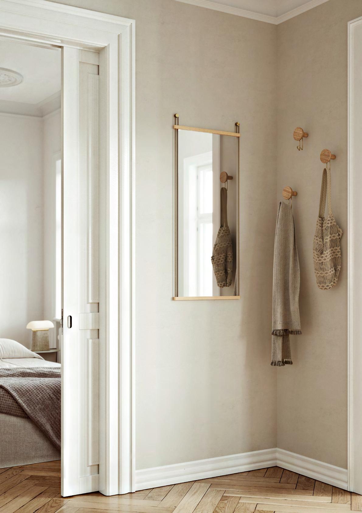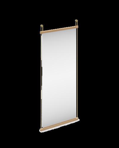 The Suspended wall mirror epitomises simplicity and beauty, crafted to harmonise with various atmospheres as a classic, lifelong piece. Featuring an elegant frame of horizontal oak slats and vertical metal rods, the mirror forms a visually distinct construction that secures the glass while providing an honest, airy aesthetic.