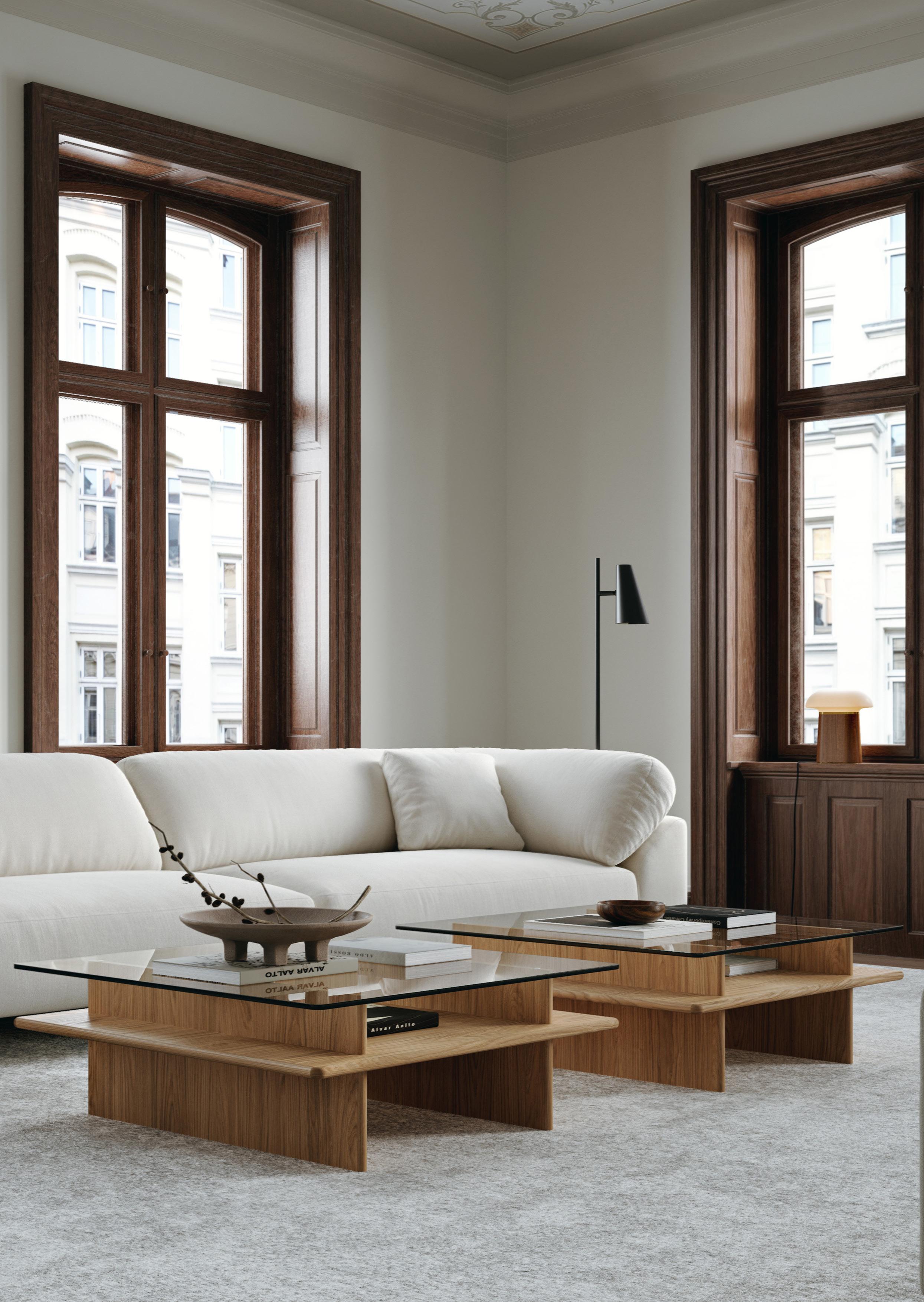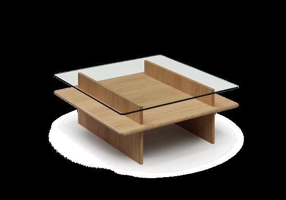 Inspired by the display showcases found in museums, the Parallel coffee table plays with the integration of curated galleries in the home. By leveraging glass, the space between the horizontal planes serves as an aesthetic exhibition area for books and decorative objects in the living room.