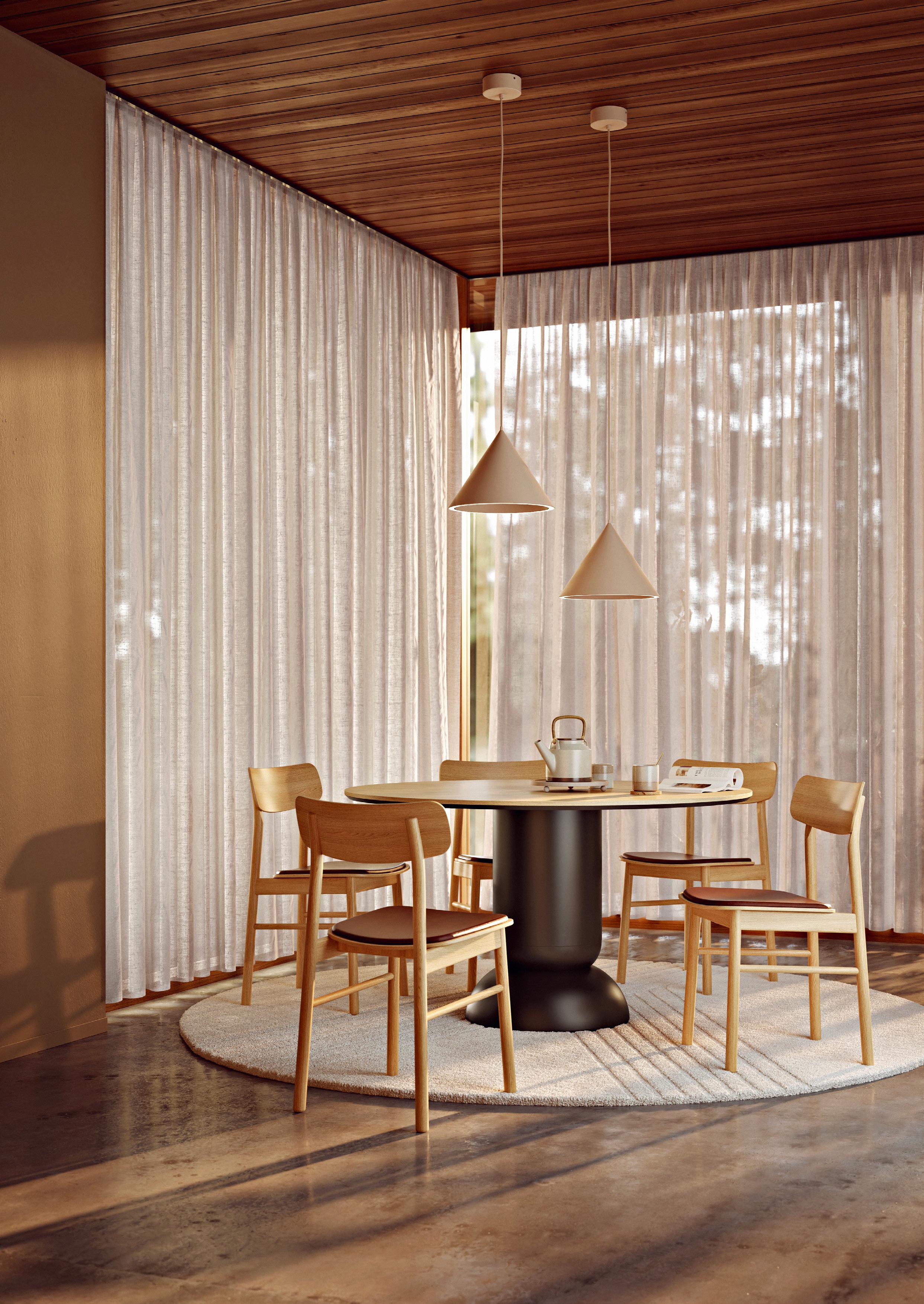 Ludo is a visually strong pillar dining table that embodies the beauty of simplicity and balance. With its wooden round top and centred base, Ludo provides ample legroom and easy accommodation for additional guests. Forming an inviting setting for conversation and cosy, engaging dinner.