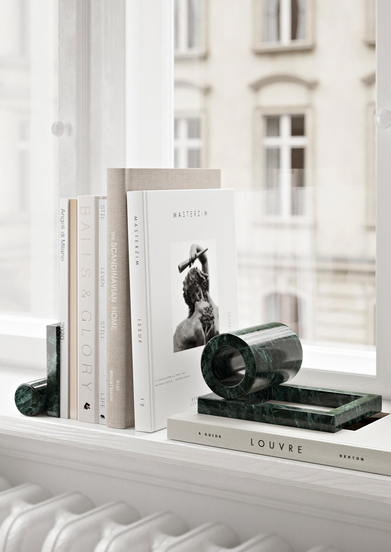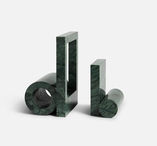 Made of smooth, solid marble, Booknd communicates an immediate and naturally beautiful aesthetic. With its graphic forms, the bookends emphatically combine soft, cylindrical shapes with consistent, straight lines, resulting in two decorative objects that have a visible mutual relationship. The Booknd is a part of the HIDN collection.