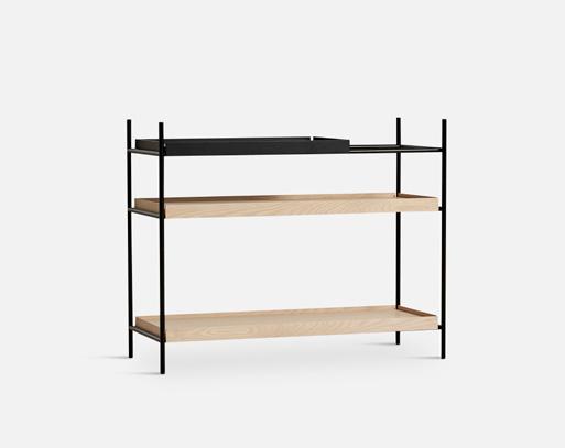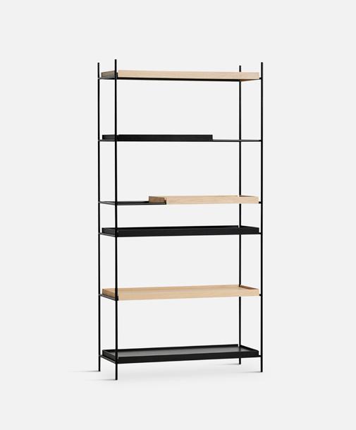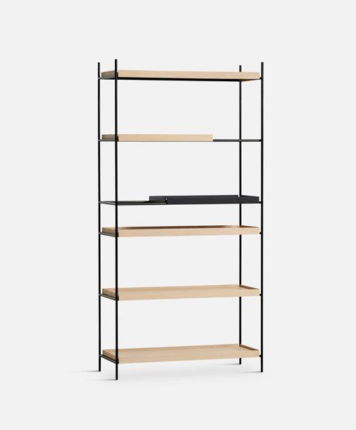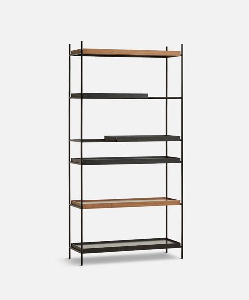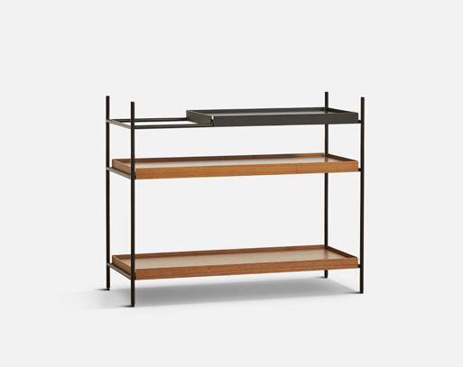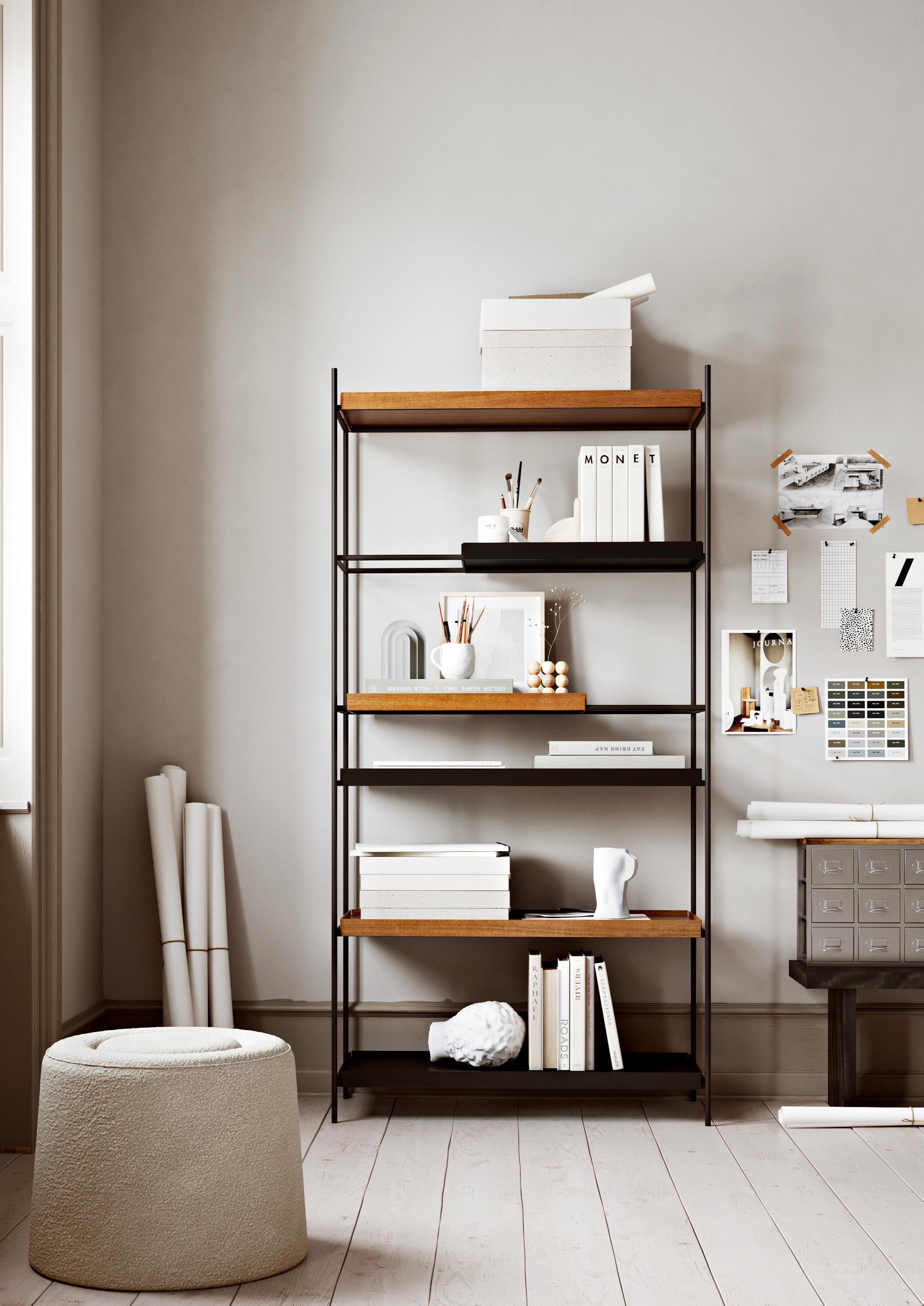 Tray Shelf is designed with a responsible mindset and the intention of maintaining its functionality and beauty over time. It features a sophisticated black painted metal frame complemented by sleek oak, black or walnut trays and is available in both high and low versions to suit your preferences.