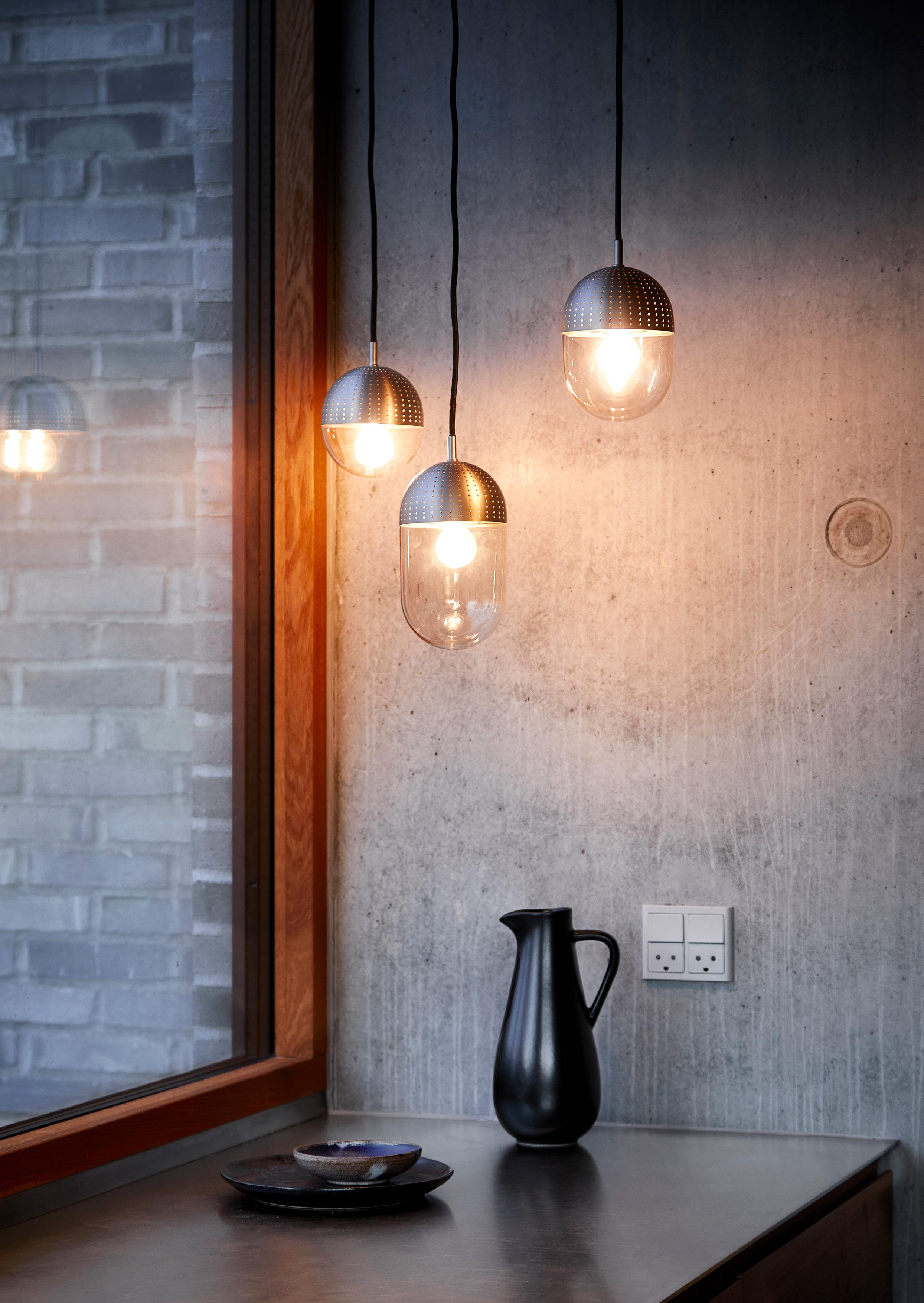 The Dot pendant is designed to create a cosy atmosphere in your home. With its elegant expression, the pendant shine whether the light is on or off. Dot comes in three different sizes. Mix and match the sizes and combine heights in a cluster of pendants. Let the light shine through the perforated metal.
