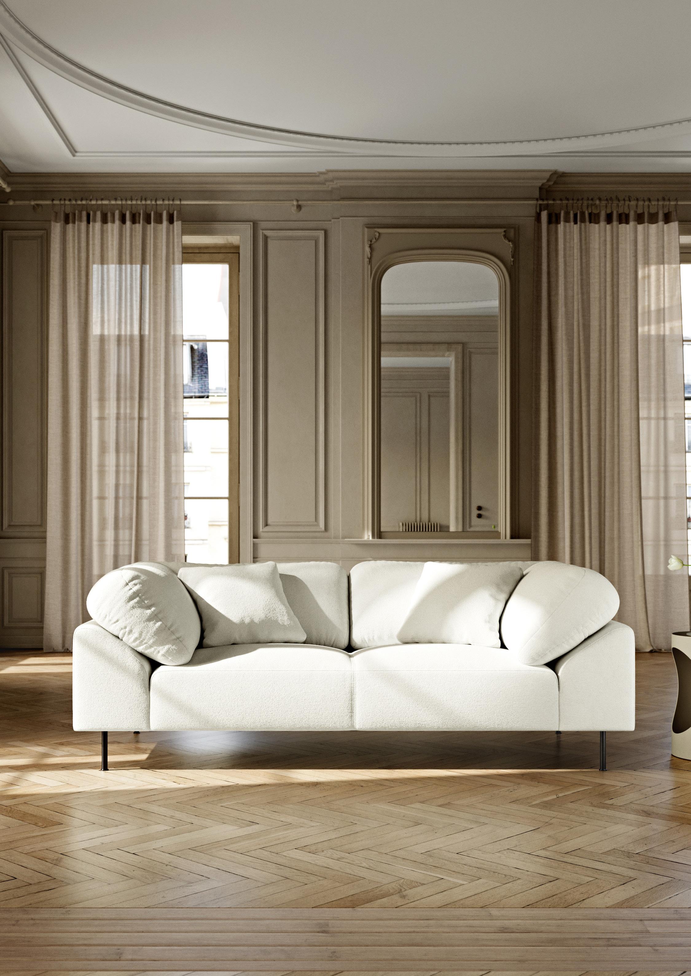 We have selected four fabric variants for the Collar sofa to stock. This includes the knobbly bouclé from Nevotex, Barnum, in a warm brown and a modern off-white and the low impact fabric, Cyber, from Gabriel in a practical dark grey and a traditional light grey.