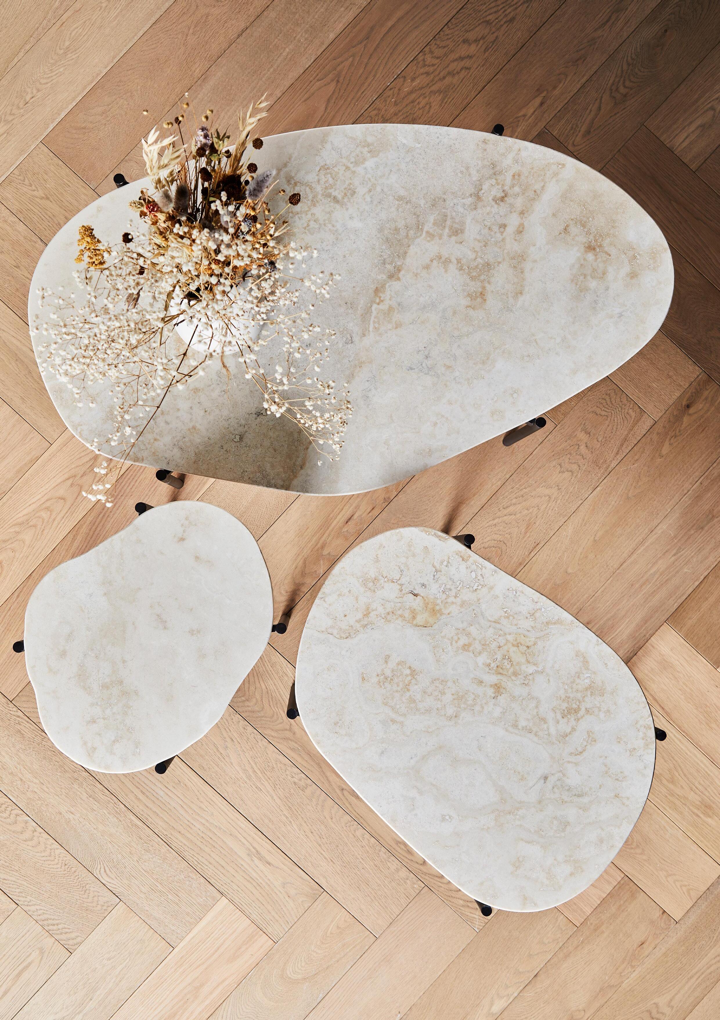 The beautiful La Terra tables come in two colours and three sizes formed in harmonious and organic shapes. Made from travertine, every surface is unique, as the play of colours varies in the natural material. Style them together as a landscape or use them individually.