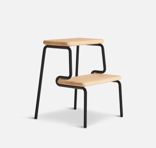 The Slalom step stool is beautifully shaped by smoothly bent metal legs that embrace solid oak planks. With its portable nature, the Slalom step stool effortlessly serves as an assistant for reaching top shelves in the wardrobe, a companion for children in the kitchen or a convenient side table by the bed.