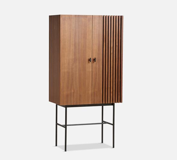 Oak/walnut veneer cabinet with black painted metal legs (smooth surface)