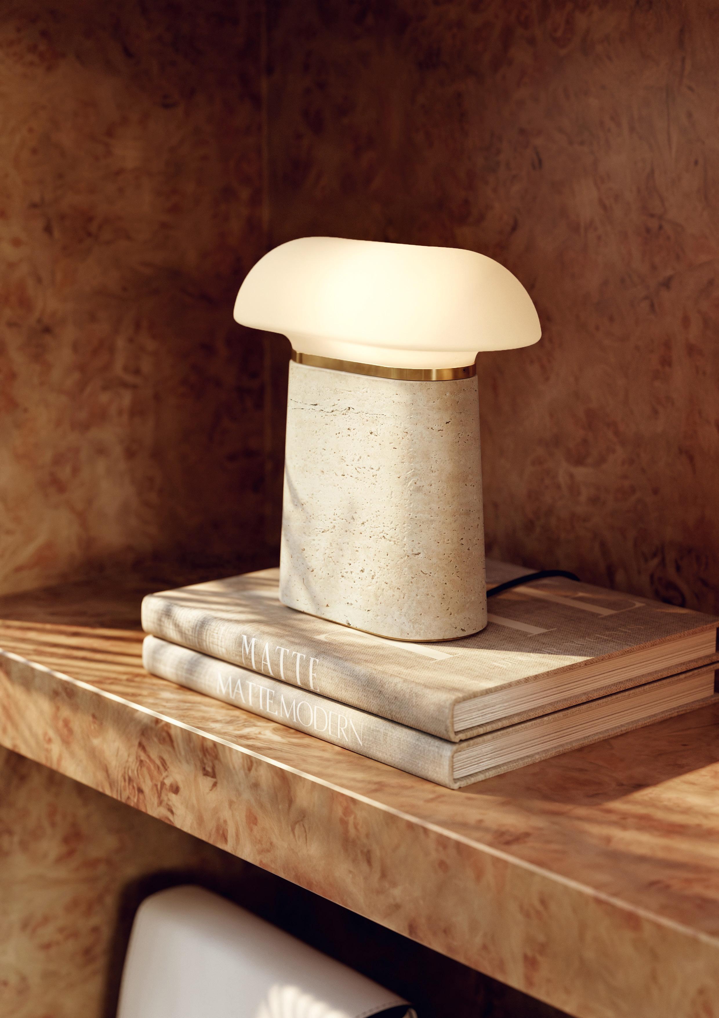 Nova is a decorative and sculptural table lamp. The rounded, airy glass shade seamlessly flows into a solid, refined core that widens towards the base. Balancing the aesthetics of delicate glass with natural, robust materials. The sleek brass element elegantly connects the shade and base into a visually well-proportioned symphony.