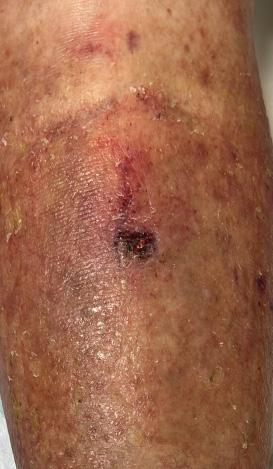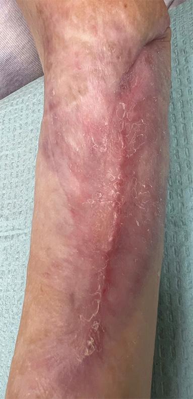 The wound was complicated by bone exposure and osteomyelitis, and the patient had a history of a prior below-the-knee amputation of her right leg due to peripheral vascular disease. Previous treatments included prolonged use of various wound care products, negativepressure wound therapy, hyperbaric oxygen, and multiple courses of antibiotics. The wound exhibited extensive tissue loss, necrotic debris, and signs of infection.