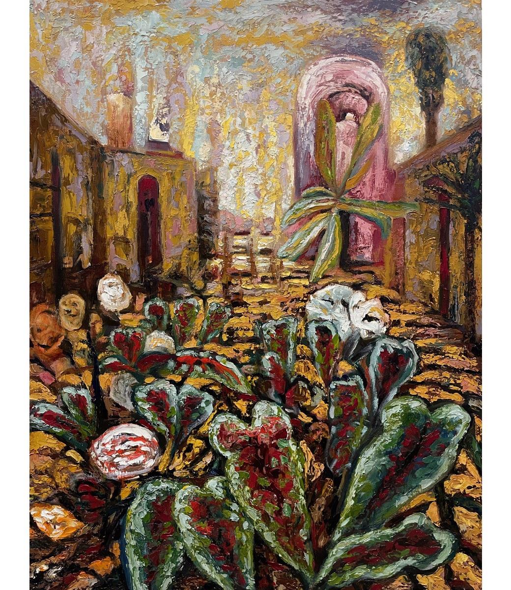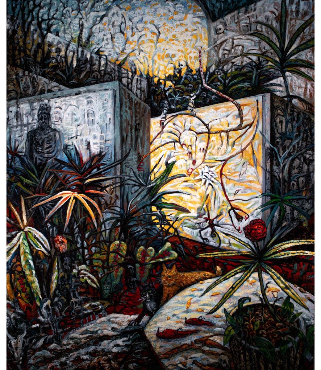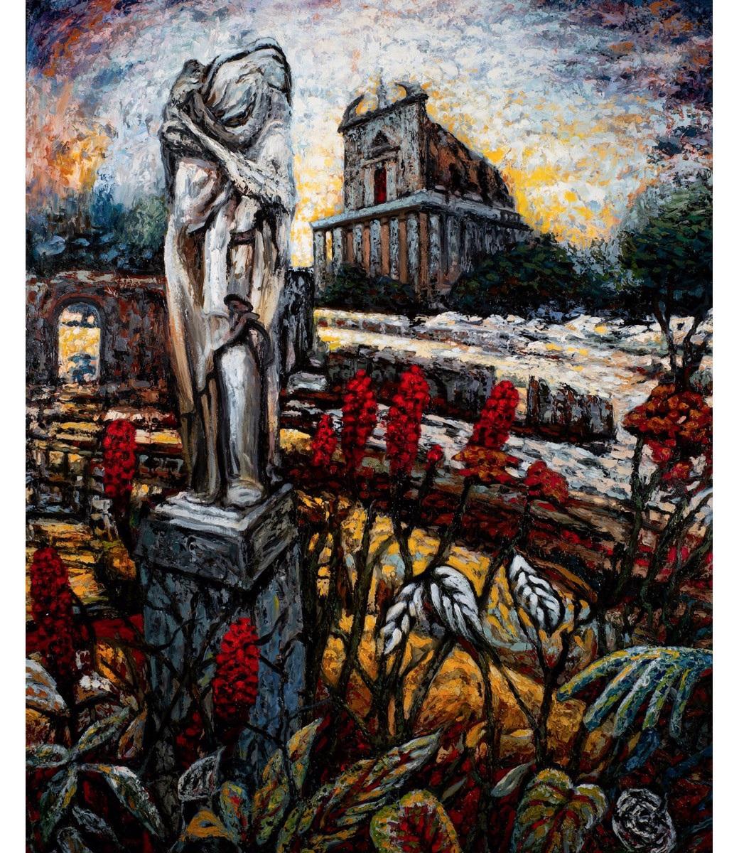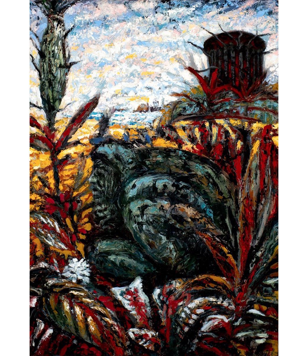 Floating between allegory and abstraction, Collins’ paintings are inhabited by the recurring forms of decaying architecture, coastal relics, ritual figures, and above all, gardens—lush and overgrown, often consuming what humanity leaves behind. In these gardens, nature is not passive, but a moral force, one that punishes hubris and restores balance. They are spaces of reckoning and regeneration.